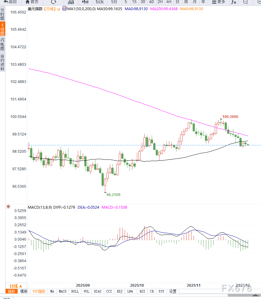 在本周一的亚洲交易时段,美元指数(DXY)延续弱势表现,跌至98.90附近,显示市场对美联储即将降息的强烈预期持续发酵。 ![]() 据市场调查显示的观点指出,当前利率预期的快速变化,是投资者对未来经济增长信心下降的直接回应。 近期美国经济数据整体呈现 温和但不强劲 的特点:就业动能有所降温,制造业活动依然偏弱,而通胀水平已经回落至美联储更能接受的区间。 这使得市场认为货币政策将进入更宽松的周期。 在此背景下,市场高度关注即将到来的美联储主席新闻发布会。如果发言偏向鹰派,则可能对美元提供短暂支撑; 反之,如果强调经济面临压力或通胀持续降温,则会进一步强化市场对降息的押注。 不过,美元也并非完全缺乏支撑。美国最新的消费者信心数据显示出一定的改善。 12月美国密歇根消费者信心指数从11月的 51.0 升至 53.3,高于预期的52.0。 有分析师表示,这一数据反映消费者对未来经济环境略有改善的判断,可能部分抵消美元的下行压力。 总体而言,当前美元走势主要受政策预期驱动,而经济数据的改善暂不足以扭转大方向。随着市场对降息的押注不断升温,美元指数短期可能继续维持弱势格局。 从美元指数的日线级别走势观察,DXY近期持续运行在下降通道内,技术面结构呈现弱势震荡下行的特征。短期均线持续压制指数反弹,而MACD动能柱保持在零轴下方,显示空头力量仍占主导。 若98.80附近的支撑位被有效下破,指数或将进一步向98.20区域测试;反之,如果在当前区间获得支撑并出现放量反弹,则可能向99.50一线发起修复性反弹。但总体而言,日线趋势仍偏空,上行动能有限。 ![]() 从结构来看,本轮美元指数的下跌更像是市场预期变化而非经济基本面恶化所致。尽管个别数据向好,但在降息概率迅速提高到90%的背景下,美元仍将承受持续压力。 未来关键变量不在数据本身,而在于美联储是否愿意明确释放更宽松的政策信号。如果政策路径更加透明,美元波动将进一步加剧。