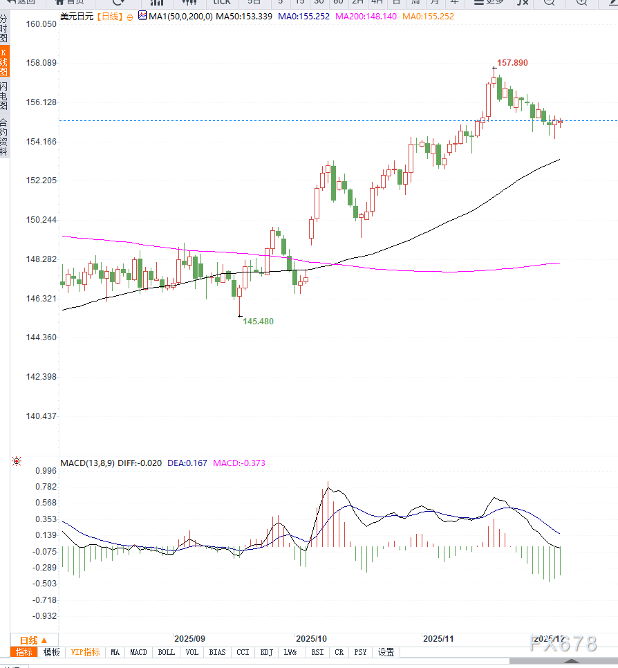 日本日元在周一亚洲交易时段持续走强,对美元保持前置优势,主要受市场对日本央行(BoJ)鹰派政策的预期支撑。 ![]() 市场对BoJ加息的押注进一步抬高日本国债收益率。 10年期基准收益率上周五达2007年以来最高水平,20年及30年期收益率则触及1999年以来新高。这一收益率上升缩小了日本与其他主要经济体利差,增强了低收益日元的吸引力。 与此同时,市场情绪谨慎,安全资产需求支撑日元的相对优势。 在美国方面,美联储降息预期继续施压美元。CME FedWatch工具显示,市场对美联储在周三再次下调利率的概率接近90%。 美元接近10月底以来最低水平,对USD/JPY形成明显压制。然而,投资者在降息路径仍不明朗的情况下,暂时倾向观望美联储更新的经济预测及主席鲍威尔讲话。 从技术面来看,USD/JPY周五未能回升至100小时均线之上,短线滑落有利于空头。日内进一步下跌可能在154.35区域获得支撑,若跌破该位,可能进一步测试154.00整数关口。 若价格出现反弹,则初步阻力在155.50附近,突破后有机会重返156.00及156.60区间,最终向157.00整数关口靠近。技术指标显示,小时图偏空,但日线震荡指标仍需谨慎对待。 市场分析师指出,日元升值主要受工资数据、鹰派BoJ预期及安全避险需求支撑,同时美元疲软进一步推动USD/JPY承压。 ![]() 当前USD/JPY呈现基本面偏多、技术面偏空的混合格局。日元受日本国内工资增长和国债收益率上升支撑,短线维持升值;而美元因美联储降息预期承压,进一步加大空头压力。 整体来看,日元在未来数日仍可能维持强势震荡,但需密切关注美联储政策信号及日本国内经济数据变化。