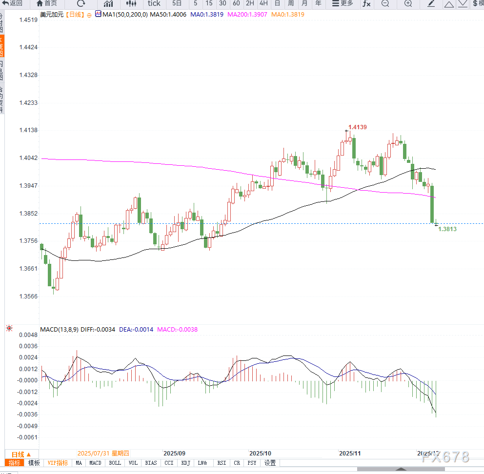 美元兑加元(USD/CAD)周一亚洲时段交投疲软,维持在约1.3800的11周低位附近。上周五,加元大幅走强,主要受到加拿大11月劳动力市场数据优于预期的推动。 ![]() 尽管就业数据利多加元,但美国与加拿大之间的贸易关系不确定性依旧是加元的主要风险点。 加拿大总理马克·卡尼与墨西哥总统克劳迪娅·谢因鲍姆会晤后,美国总统唐纳德·特朗普表示,相关谈话“非常好、非常富有成效”,但并未说明美国何时重启与加拿大的贸易谈判。 当被问及是否恢复与加拿大的磋商时,特朗普仅回应“再看看”,增加了市场对贸易前景的犹疑。 与此同时,美元在本周美联储决议前保持谨慎。 市场普遍预计,美联储将在周三宣布降息25个基点至3.50%-3.75%区间,原因是美国劳动力市场持续放缓。这一政策预期令美元承压,从而进一步推低了USD/CAD走势。 从日线图来看,USD/CAD持续维持在下降压力通道内运行,整体结构呈现偏空震荡下行的技术特征。汇价上周跌破50日均线后,反弹始终受压,显示空头仍占主导。 MACD动能柱维持在零轴下方,表明下行动能尚未完全释放;RSI徘徊在40附近,显示弱势整理但尚未触及超卖区域。若价格持续承压于1.3860下方,日线趋势或继续指向1.3780与1.3720支撑区域; 反之,如短线出现强势反弹并重新站上1.3920,则可能启动技术修复,进一步上望1.3980阻力。不过当前整体趋势仍倾向于下行。 ![]() : 当前USD/CAD已跌至11周低点,基本面偏向利空美元、利多加元。若美联储如预期降息,且加央行保持按兵不动,加元可能进一步走强。技术面来看,1.3780为短线关键支撑,若跌破将打开进一步下行空间至1.3720。 而若美联储意外释放鹰派信号,美元或迎来短线反弹,关注1.3870与1.3920阻力区。整体而言,走势依旧偏空。