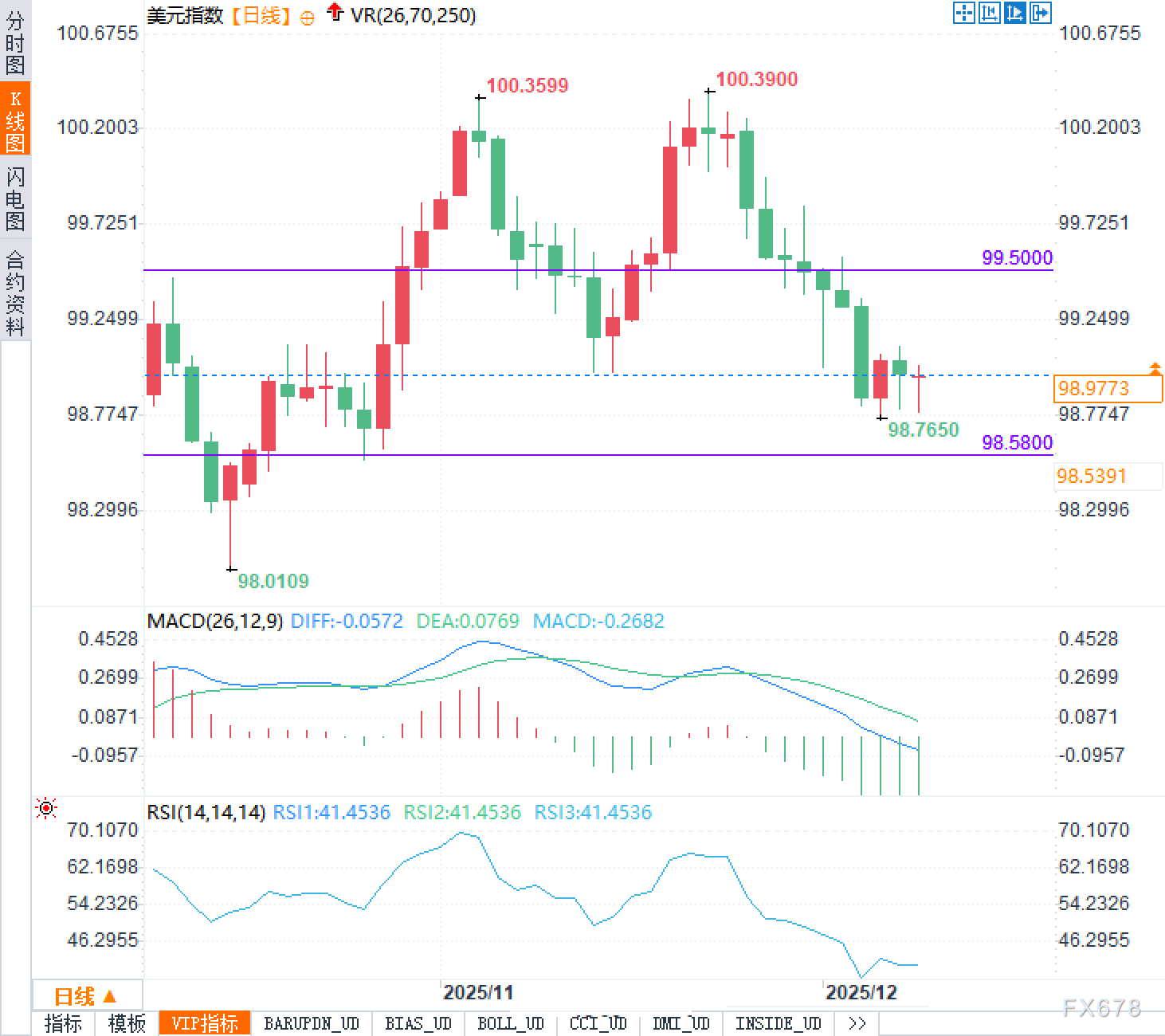 012月8日,星期一美市盘前。美元指数目前交投98.98附近,正处于一个关键的观察窗口期。尽管近期美国12月消费者信心有所回升,密歇根大学公布的数据显示信心指数升至53.3,显示出部分乐观情绪,但这并未改变整体疲 ...