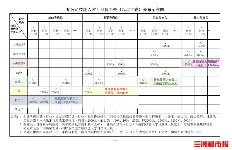 《技能人才最低工资分类参考指引》示意图。图源:人社部官网 岗位分类上,《指引》按重要程度和技能要求,将技能岗位划分为基础类、重要类、关键类、核心类四类。 基础类以重复性工作为主,需单一简单技能;重要类需处理特定领域复杂工作,要求专业精深技能;关键类承担跨领域复杂任务,需综合技能储备;核心类聚焦重大技术攻关,要求精通多领域知识和高超技能。这种分类打破行业壁垒,既适用于制造业技术工人,也涵盖环卫、家政等服务行业从业人员。 技能分级方面,《指引》支持“新八级工”(学徒工、初级工至首席技师)序列,也允许企业灵活划分并对应。薪酬标准清晰:基础类月最低工资不低于本地法定标准的105%,重要类不低于120%,关键类不低于150%,核心类不低于200%;特级技师、首席技师最低工资不低于所在领域高级专业技术人员或管理人员工资低位数。 文件遵循凸显技能价值、反映技能差别等原则,通过集体协商确定薪酬,既保障权益又给企业留空间。 政策红利加码,湖南为技能成才添柴加薪 作为制造业大省和劳务输出大省,湖南始终重视技能人才队伍建设,接下来将以《指引》落地为契机,完善培养、评价、激励全链条机制,政策红利持续加码。 薪酬保障上,湖南2025年9月1日起实施新最低工资标准,月最低工资分2200元、2000元、1800元三档,小时最低工资分22元、20元、18元三档。与2024年相比,月最低工资标准的每档均提高了100元/月,小时最低工资标准的每档均提高了1元/小时,筑牢技能人才薪酬底线。“我们会结合行业特点、企业效益和技能等级,科学测算薪酬,确保技能要素占比合理。”长沙一家制造业企业人力资源负责人表示。