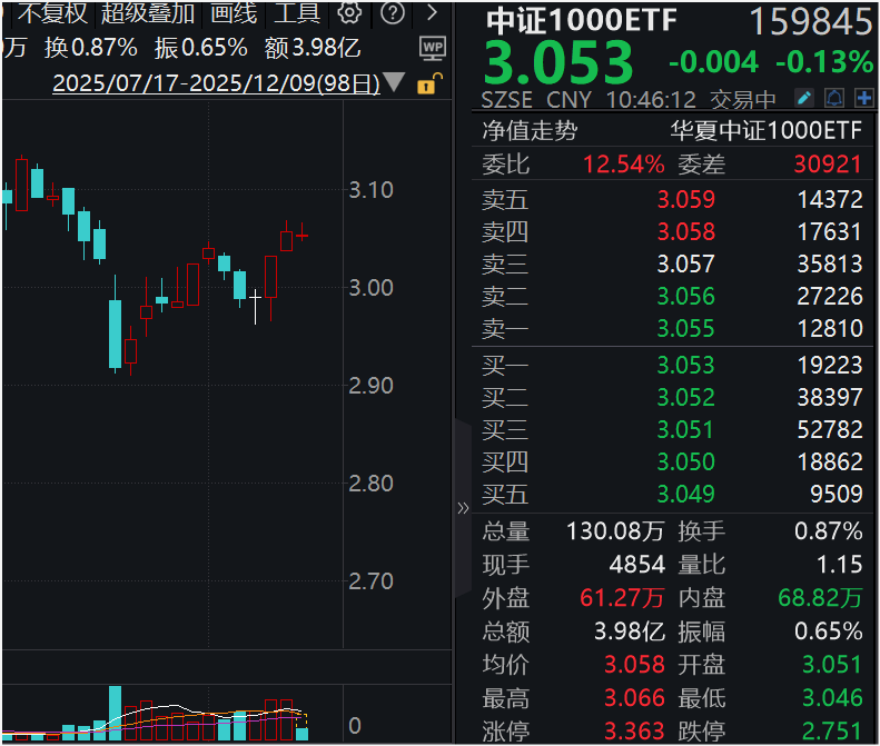 12月9日上午,A股三大指数走势分化,其中沪指下跌0.11%。截至10:45,中证1000ETF(159845)下跌0.13%。其他宽基指数中,上证50跌0.37%,沪深300跌0.09%,中证500跌0.26%。