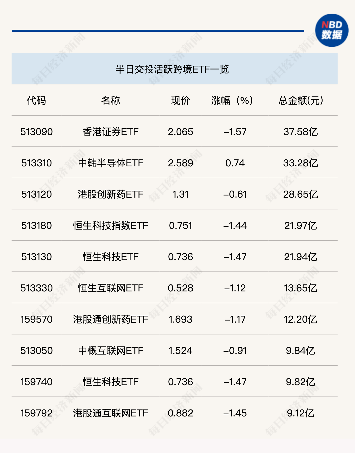 每经记者|刘明涛 每经编辑|肖芮冬 今日上午,通信和金融相关ETF交投相对活跃。其中,通信ETF(515880)半日成交金额达到13.3亿元,证券ETF(512880)、券商ETF(512000)以及银行ETF(512800)半日成交金额近10亿元。跨境ETF方面,香港证券ETF半日成交金额为37.58亿元,成交金额环比大幅萎缩。