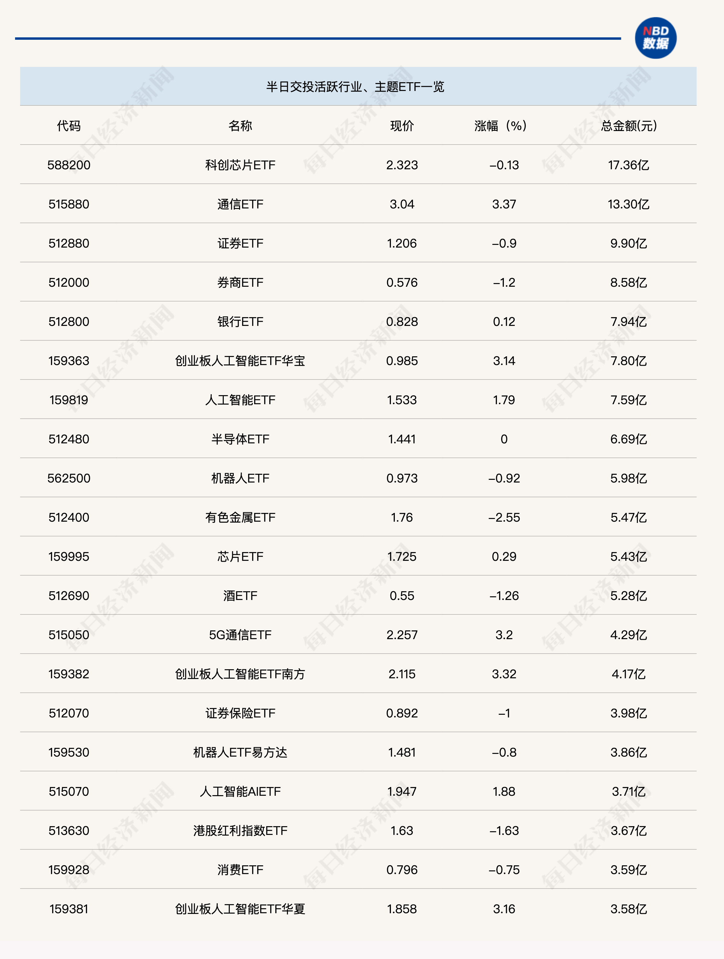0每经记者|刘明涛 每经编辑|肖芮冬 今日上午,通信和金融相关ETF交投相对活跃。其中,通信ETF(515880)半日成交金额达到13.3亿元,证券ETF(512880)、券商ETF(512000)以及银行ETF(512800) ...