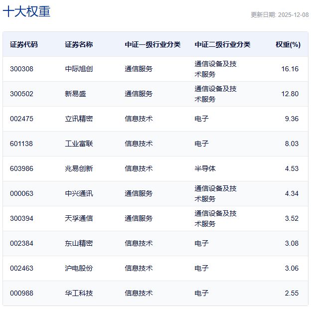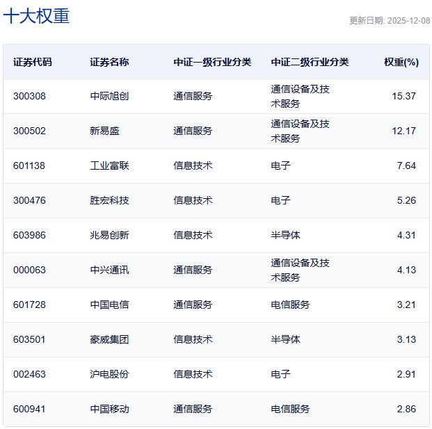 中证5G产业50指数主要权重股 点评:5GETF(159994)和5G通信ETF(515050)今日上午分别上涨3.41%和3.2%。其中,5G通信ETF(515050)份额达到37.57亿份,半日成交金额为4.29亿元。上述两只ETF追踪的是中证5G通信主题指数。 中证5G通信主题指数选取业务与5G建设或应用相关的上市公司证券作为指数样本,包括但不限于5G基础建设、终端设备以及应用场景,旨在反映5G通信主题上市公司证券的整体表现。该指数研发支出占比较高,成分股预期营收增速高,未来增长强劲,且目前估值水平处于低位。