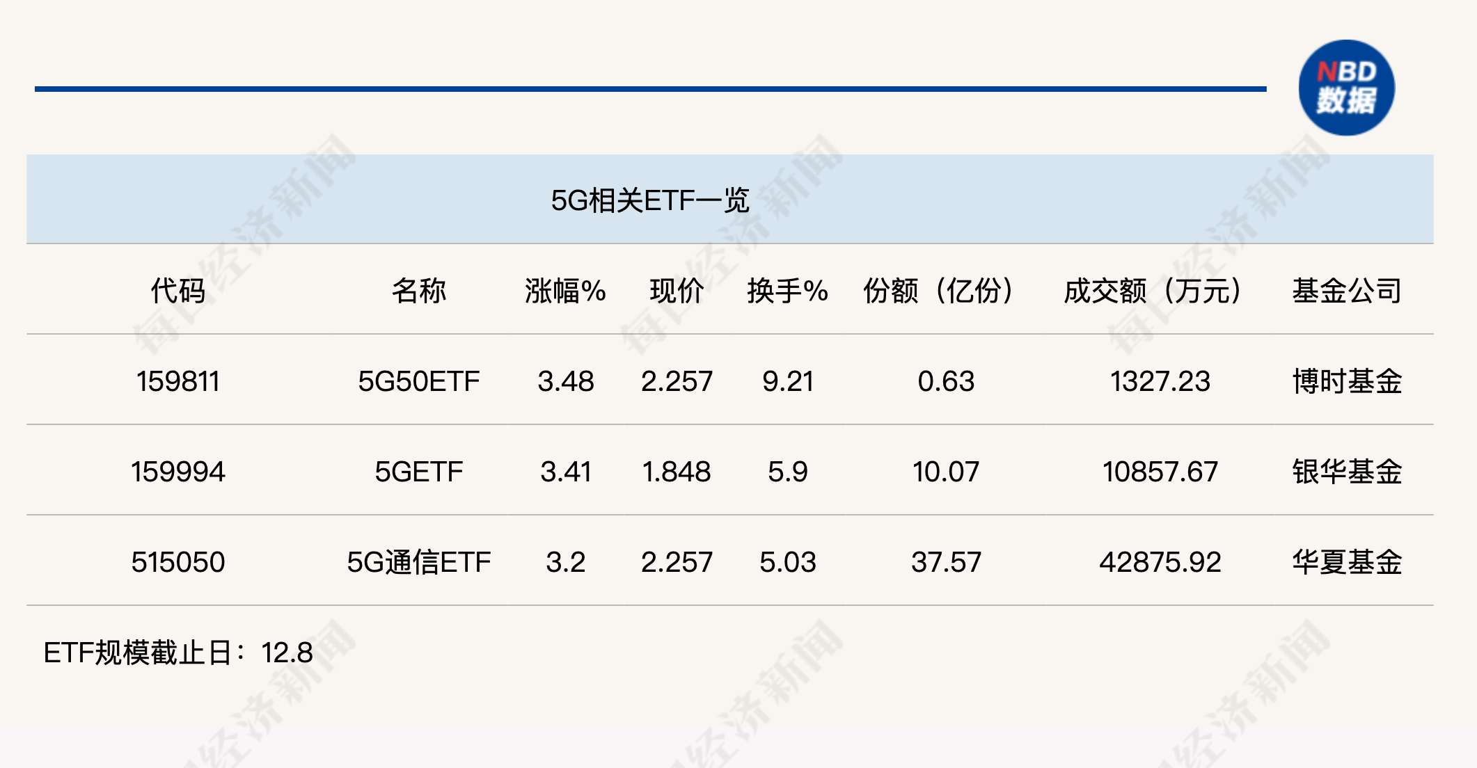 ETF涨幅榜上,5G、通信设备以及创业板人工智能相关ETF依旧是目前资金热捧的三大方向。其中,5G相关ETF今日表现出色,两只5GETF半日涨幅近3.5%,领涨整个ETF市场。