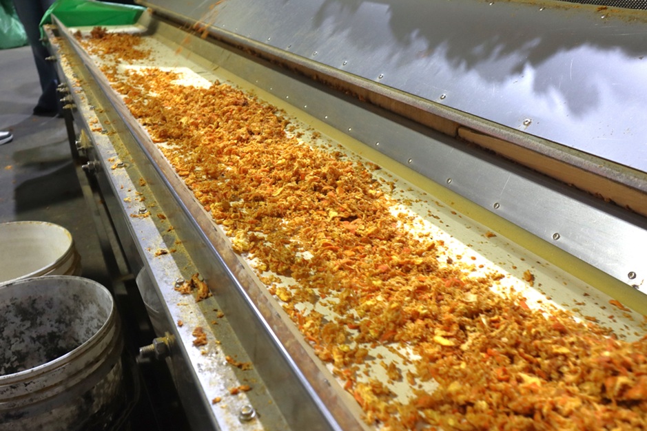 脐橙榨汁车间的全自动生产线。杨思颖摄 “我们的目标是一颗橙子也绝不浪费。”公司董事长戴润平自豪地介绍。 榨汁后的橙皮,在过去是废弃物,如今却变废为宝。它们被送入烘干车间,加工成十三香等调味品的优质原料;进一步深加工,还可提取橙皮精油,用于化妆品和食品工业;甚至连最后的果渣也能转化为有机肥,反哺果园。