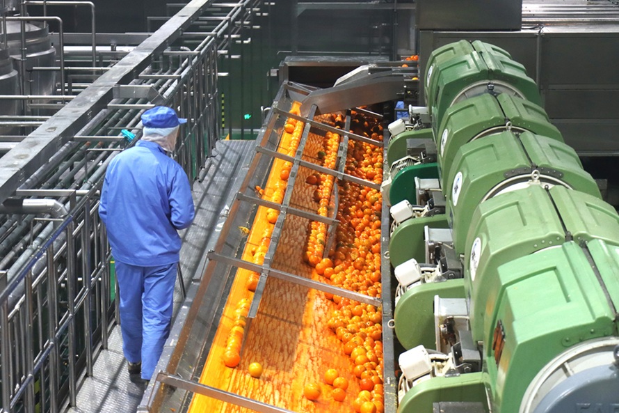 月汉村种植园的崀山脐橙。杨思颖摄 被誉为“全球华脐第一村”的月汉村,坐落于典型的喀斯特地貌区,土层薄、水资源相对匮乏,但却为脐橙生长提供了得天独厚的条件。富含矿物质的丹霞土壤,加之充沛日照和显著温差,共同孕育了崀山脐橙果皮细腻、汁多味浓、酸甜可口的独特品质。 发现了这一得天独厚的地理优势,从20世纪70年代开始,乡亲们着手从石头缝里开创“甜蜜事业”。 50余年的耕耘,“甜蜜事业”发展出了强大的技术力量:全村拥有130多名中级园艺师、70多名农艺师组成的专业种植队伍。他们推广标准化种植,严格管控剪枝、施肥、病虫害防治等环节,确保每一颗橙子都达到高品质。 现如今,新宁县脐橙种植面积达50万亩,年产量70万吨,年产值高达50亿元,脐橙种植单县面积居全国第一。崀山脐橙先后获得农业部优质农副产品金奖,成为国家地理标志保护农产品,不仅畅销国内,还远销俄罗斯等40多个国家和地区。 一颗橙子的“全产业链”之旅 丰收的喜悦,也曾伴随着“果贱伤农”的忧虑。如何让橙子卖得更好、价值更高? 答案藏在山下的工业园区里。 在湖南山之良科技有限公司的智能化车间,一场橙子的“深度蜕变”正在上演。新鲜采摘的脐橙坐上全自动流水线,首先接受一场精密“体检”。基于近红外光谱技术的光电分选机,能瞬间检测出每个橙子的色泽、大小、糖度、酸度,并自动分级。优质果直接供应鲜果市场,其余的则踏上深加工之旅。 在洁净的榨汁车间,橙子经过清洗、压榨,变成原浆。这里采用了国际领先的HPP超高压冷杀菌技术,取代传统高温杀菌,能在杀灭有害微生物的同时,最大限度地保留脐橙的原始风味和维生素等营养成分,口感如同现榨。