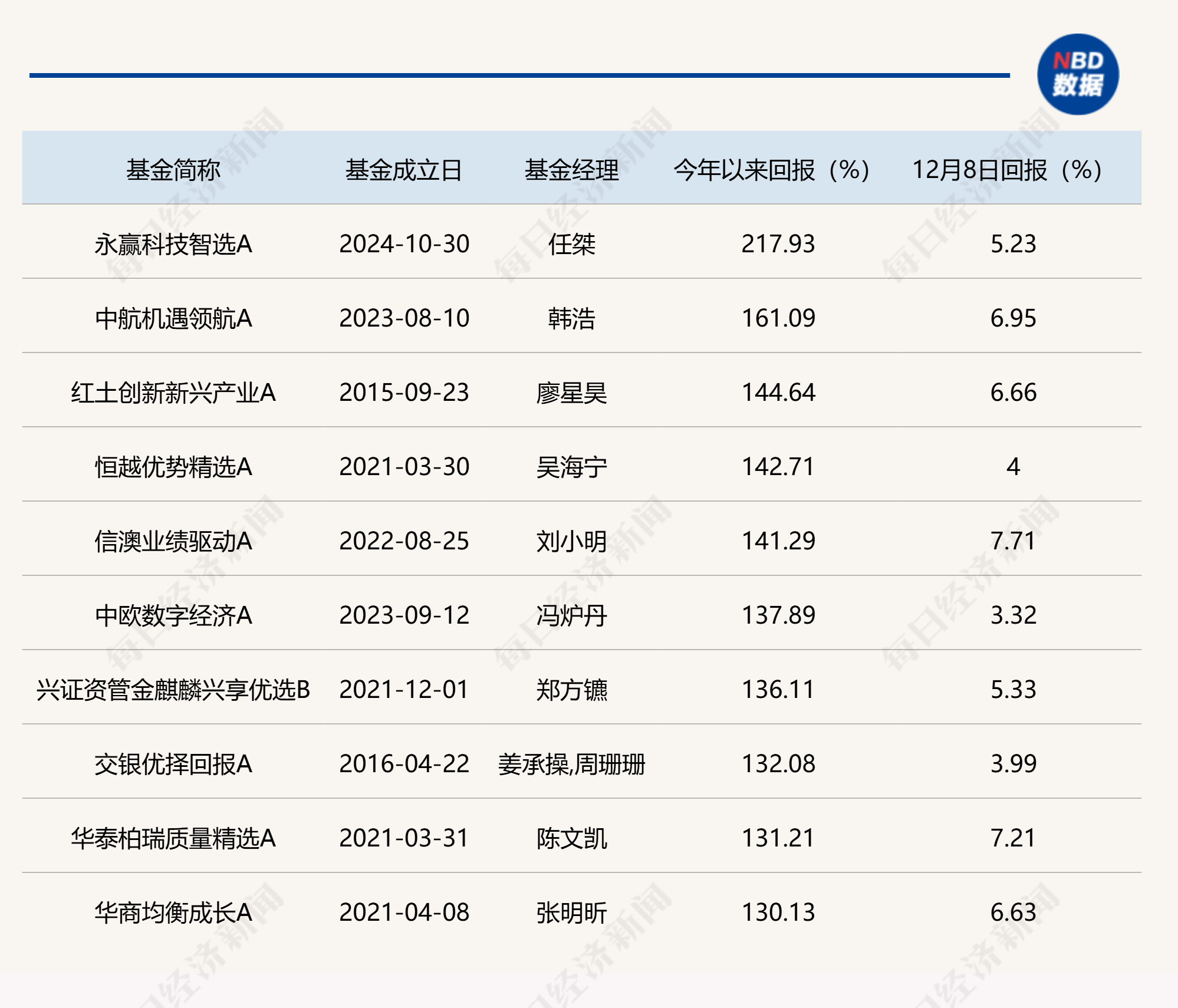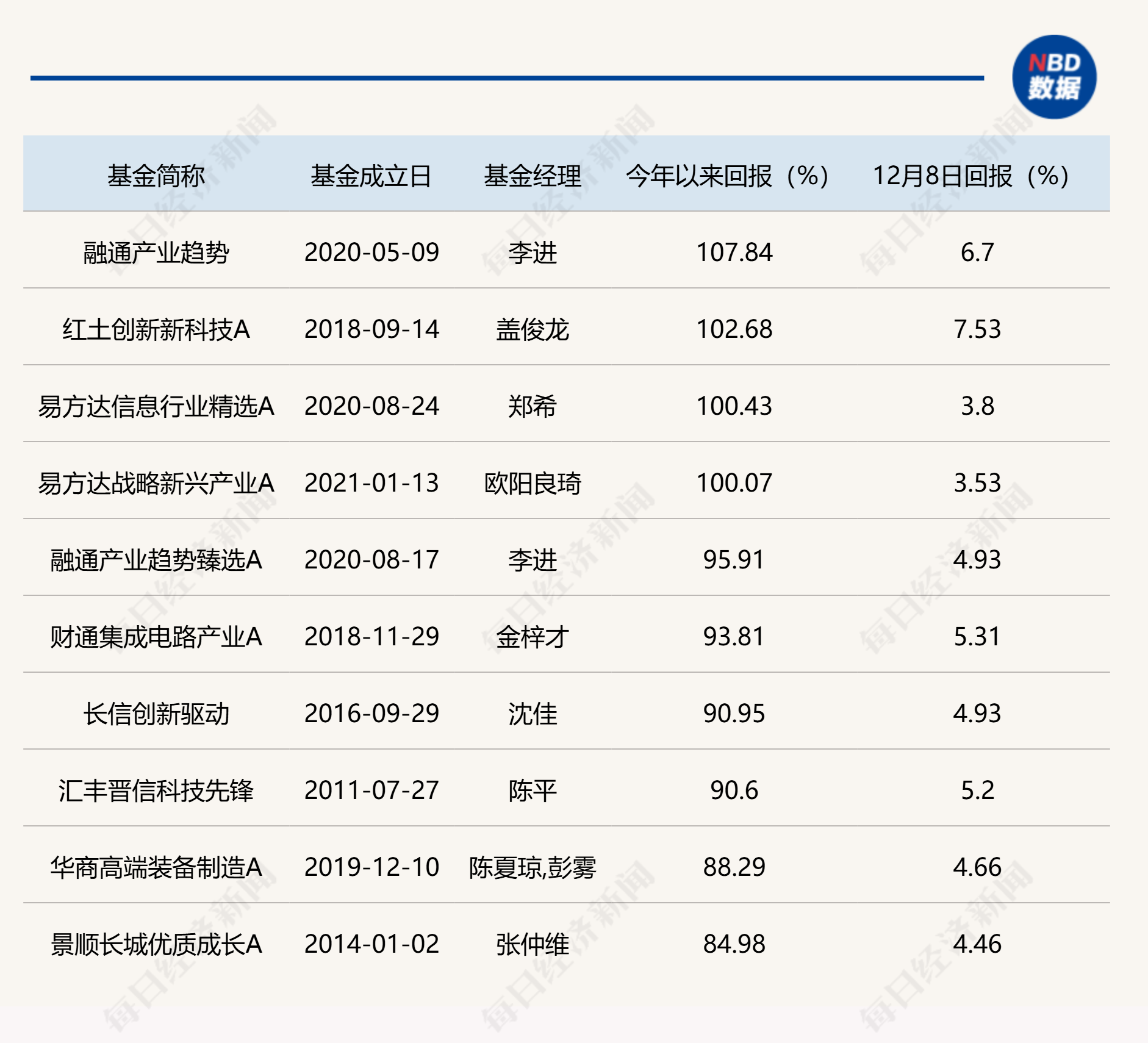 混合型基金年内回报前十名(截至12月8日) 从这份统计来看,虽然部分排名靠前的科技类基金年内收益已经翻倍,甚至已经超过200%,但单日回报依然可观,不乏有产品单日净值上涨超过5%。随着这一波科技行情的延续,这些基金的净值均有望创新高。 业内观点:AI算力竞赛远未结束,产业链核心公司高景气有望持续 对于近日科技板块的持续上涨,以及相关主题基金的强势反弹,不少业内人士分析,展望后市,12月中国市场进入政策与流动性向上共振期,以通信为代表的大科技板块依旧是市场长期看好的主线赛道。 银河基金指出,Wind数据显示,通信板块方面,受海外科技企业AI芯片发布等因素影响,软硬件相关联动推动CPO(共封装光学)需求出现调整,对通信板块走势产生带动。电子板块方面,国际科技企业AI终端产品进入密集发布阶段、存储行业大周期呈现向上态势以及算力芯片国产化进程持续推进等多方面因素,共同对电子板块上涨形成推动。 重磅会议对后续经济工作的定调,让市场情绪回暖。可关注科技细分领域以及政治局会议定调中排序相对靠前,定位较为重要的内需相关方向的发展。 中信保诚基金也表示,国庆节后市场出现一定震荡,尤其是前期涨幅较大的科技板块波动加剧。但从中期来看,支撑市场向好的核心叙事并未改变,暂对市场中长期维持“慢牛”判断,保持多头思维,利用调整布局未来机会。 富荣基金则表示,通信行业上涨的核心驱动因素在于海外AI算力基本面再获强验证。展望后市,继续看好AI相关的光通信、PCB(印制电路板)、存储等产业链环节。“AI算力竞赛远未结束,技术迭代仍在加速,2026年产业链核心公司高景气有望持续。”富荣基金指出。 封面图片来源:每日经济新闻 |