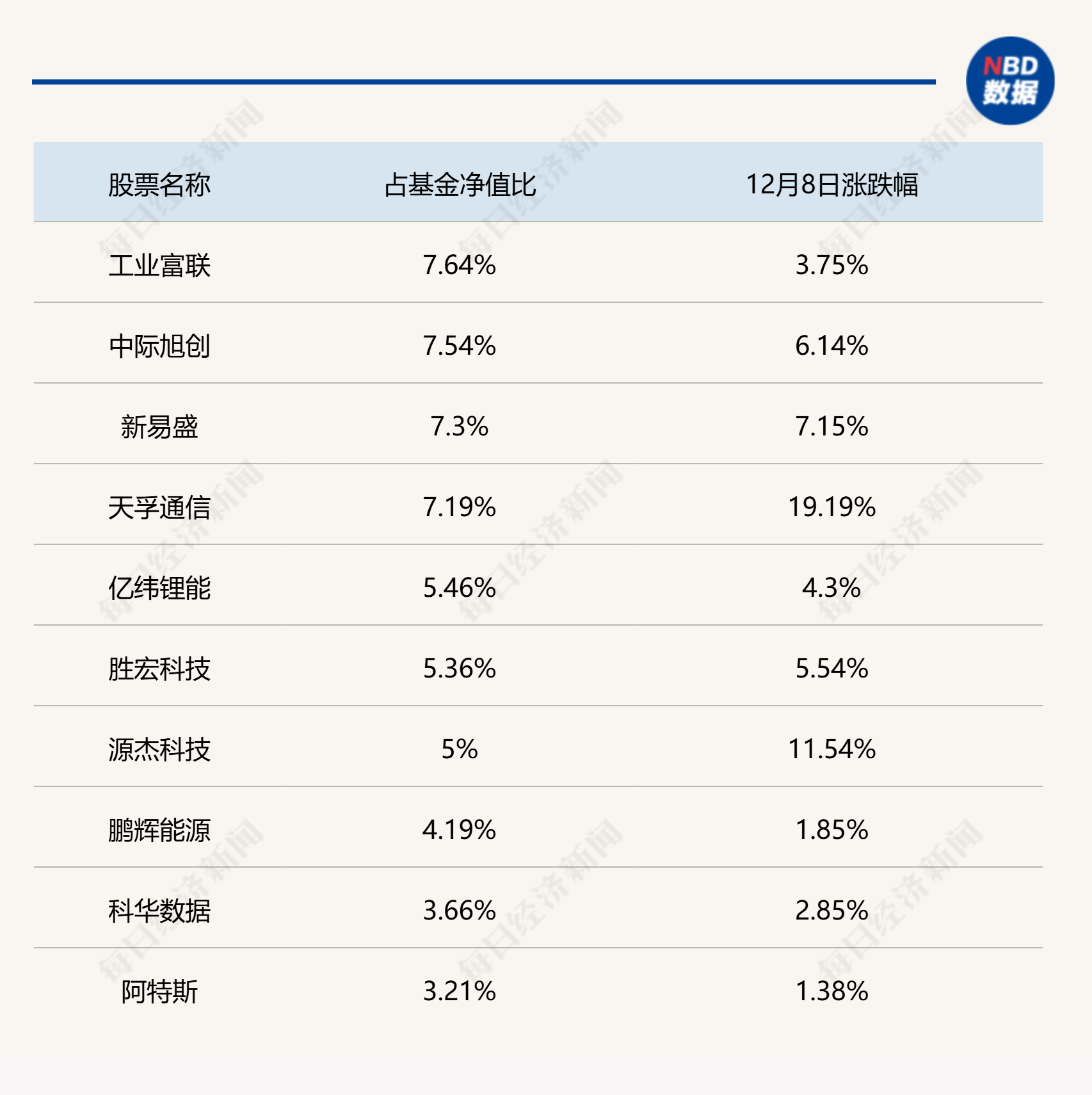 与红土创新科技创新相似,第三大重仓股天孚通信涨停,同时源杰科技上涨11.54%,另外新易盛、中际旭创、仕佳光子、胜宏科技、东山精密、长飞光纤等多只个股单日涨幅超过5%,并且这些个股今日还在继续上涨。 事实上,除了主动基金,被动产品方面,通信、人工智能等主题ETF也涨幅领先,单日上涨超过5%的不在少数,这里不再一一列举。 每经记者注意到,在12月8日涨幅靠前的产品中,不少也是今年的绩优基金。例如红土创新新科技A和红土创新科技创新基金,年内收益分别排在同类970只产品中的第2位和第87位,华泰柏瑞质量成长A和诺德新生活A也都排在同类超4000只产品中前1%的位置。