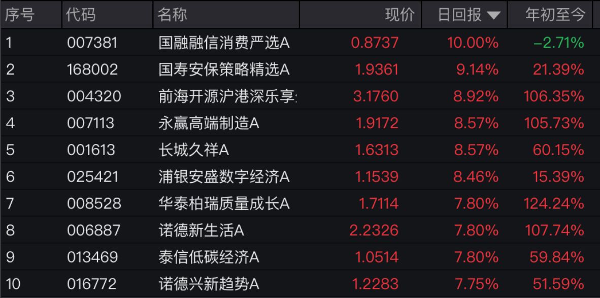 每经记者|李蕾 每经编辑|叶峰 《每日经济新闻》记者获悉,昨日A股市场成交额重返2万亿元,AI(人工智能)算力概念爆发,尤其是光模块概念股集体上涨,带动相关主题基金和重仓科技的基金同步大涨。 根据Wind数据,红土创新科技创新基金和红土创新新科技A在12月8日的净值涨幅都接近8%,并且这两只产品近2个交易日的涨幅超过10%,最新净值创下新高。另外,重仓科技的华泰柏瑞质量成长A、诺德新生活A等多只产品的单日涨幅超过7%,融通产业趋势、国泰金鑫A、广发先进制造A等单日涨幅也超过6%,显示出强势反弹的趋势。 今日(12月9日),科技板块在算力和AI应用推动下继续保持强劲势头。在部分业内人士看来,通信行业此番上涨的核心驱动力在于海外人工智能算力基本面再获强力验证。在AI浪潮的席卷下,以通信为代表的大科技板块依旧是市场长期看好的主线赛道。 科技基金强势反弹,有产品近两日收益超10% 近日科技板块开启上涨模式,尤其是受到AI算力需求持续增长和技术迭代的推动,12月8日光模块概念股集体爆发,相关个股涨幅显著。例如,天孚通信涨超19%,光库科技、德科立等个股涨超10%,后者在今天继续涨停。 受此影响,多只科技类基金应声反弹。Wind数据显示,12月8日当天多只科技主题基金和重仓科技的基金净值明显上涨,其中红土创新科技创新基金和红土创新新科技A的涨幅分别为7.94%和7.53%。如果加上前一个交易日(12月5日)的涨幅,那么这两只基金的近两日涨幅都已经超过10%,红土创新科技创新基金的净值创下新高。 重仓科技的华泰柏瑞质量成长A、诺德新生活A净值日涨幅也达到7.80%,此外还有多只产品单日上涨超过6%,显示出较强的增长势头。 股票型基金涨幅前十