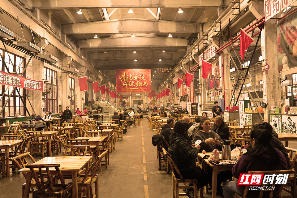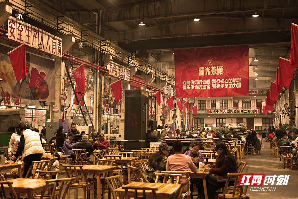 红网时刻新闻记者 陈杰 长沙报道 斑驳的机器与芝麻豆子的茶香交织,旧工业时代的轰鸣如今被欢声笑语取代……这里是长沙曙光茶厂·湖南米粉博览馆——一个让几代人找回青春记忆的地方。 走进曙光茶厂·湖南米粉博览馆,仿佛踏入了一条连接过去与现在的时空隧道。我端起相机,对准了一台锈迹斑斑的旧机床。一位老人正指着它,对身旁的孙儿轻声说道:“这就是我们当年的青春。”老厂房的墙壁上,还保留着上世纪五六十年代流行的宣传画,所有的岁月痕迹都被完好无损地保留下来。 一名退休工人告诉我,每次来这里喝茶,都像是回到了自己的青年时代。这些老物件虽然不是古董,却是那个年代真实的见证,每一道划痕都是一个故事。 在工作日,这里是老年人的聚集地,他们悠闲地品着芝麻豆子茶,仿佛时间都慢了下来。 一位摄影师同行告诉我,他最钟爱的是黄昏时分,夕阳透过老厂房的窗户,在地面上投射出斑驳光影。他说,那一刻按下快门,总能捕捉到记忆与现实最美妙的交融。他们或许从未见过这些机器运转的样子,却被那种沧桑感和历史美感深深吸引。 不远处,几位老人正围坐一起打牌,瓷茶缸随意地摆在桌上,竹椅发出的吱呀声,勾起了我对老长沙的记忆。 这些老厂房改造时并没有大动干戈,而是选择了“修旧如旧”的方式。这种改造方式让整个空间既保留了原有的工业韵味,又注入了新的生命活力。 那些曾经沉寂的工业遗存,如今在茶香与米粉热气中重获新生。这里不仅仅是消费场所,更像是一座城市记忆的活态博物馆,让长沙市民在时代变迁中,常怀一份对城市记忆的尊重。