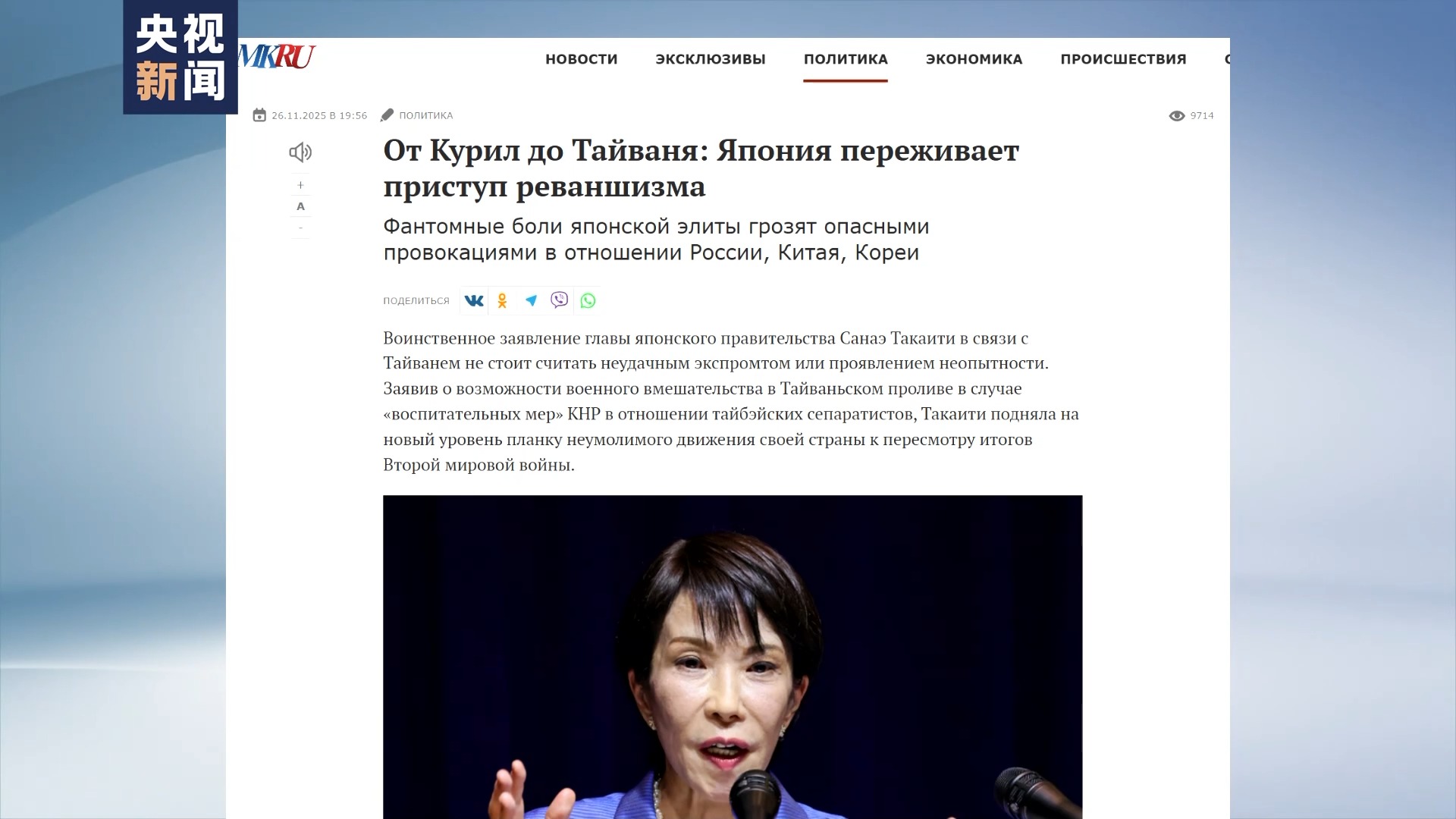 此外,俄罗斯《莫斯科共青团员报》刊文指出,日本首相高市早苗此前发表的涉台错误言论并非失言,而是日本持续推动修正二战战败结果的又一动作。文章警告,日本的扩军、谋求核武等倾向可能危及地区安全,呼吁俄中及周边国家加强协调,抵制日本复活军国主义的动向。 |