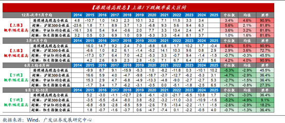 又到年底,投资者都在寻找提升收益的机会。除了常规渠道,港股市场中的高股息板块,往往在每年12月至次年1月中旬呈现一段特殊的“旺季行情”。这种基于历史重复出现的季节性规律,常被称为“日历效应”。 一、 历史数据说话:上涨与超额收益概率双高 以跟踪广泛、历史较长的港股通高股息全收益指数为参考,自2014年至今的统计显示:在此期间(12月至次年1月中旬),绝对收益亮眼——上涨概率高达 90.9%,期间涨幅中位数达 3.4%,平均涨幅 4.6%。意味着几乎年年上涨,且平均收益可观。