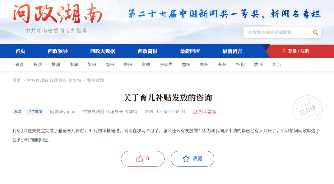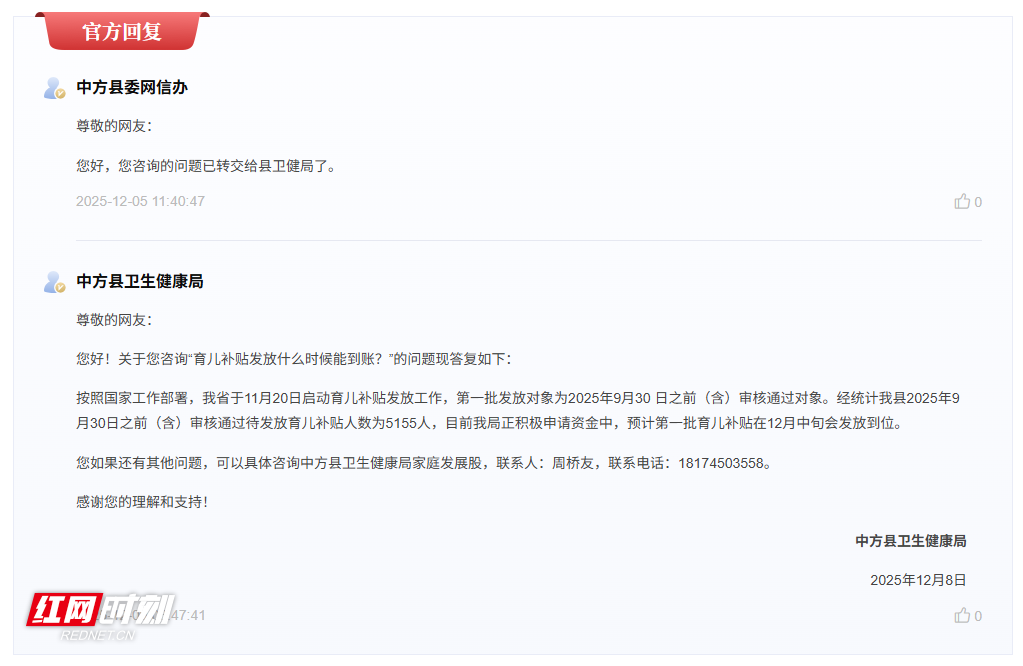 网友在《问政湖南》栏目上的发帖内容与官方回应。 红网时刻新闻12月10日讯(记者 陈星晓)近日,有网友在红网《问政湖南》栏目留言,咨询育儿补贴发放进度,称自己8月底完成登记并通过审核,但近两个月仍未收到补贴,而同期申请者已有到账情况。该问题引起部分民众关注。 对此,中方县卫生健康局作出公开回应。回复中说明,按照国家工作部署,湖南省育儿补贴发放工作于11月20日正式启动。第一批发放对象为2025年9月30日(含)前审核通过的对象。经统计,中方县符合首批发放条件的人员共5155人。目前,该局正积极申请资金中,预计第一批育儿补贴在12月中旬会发放到位。