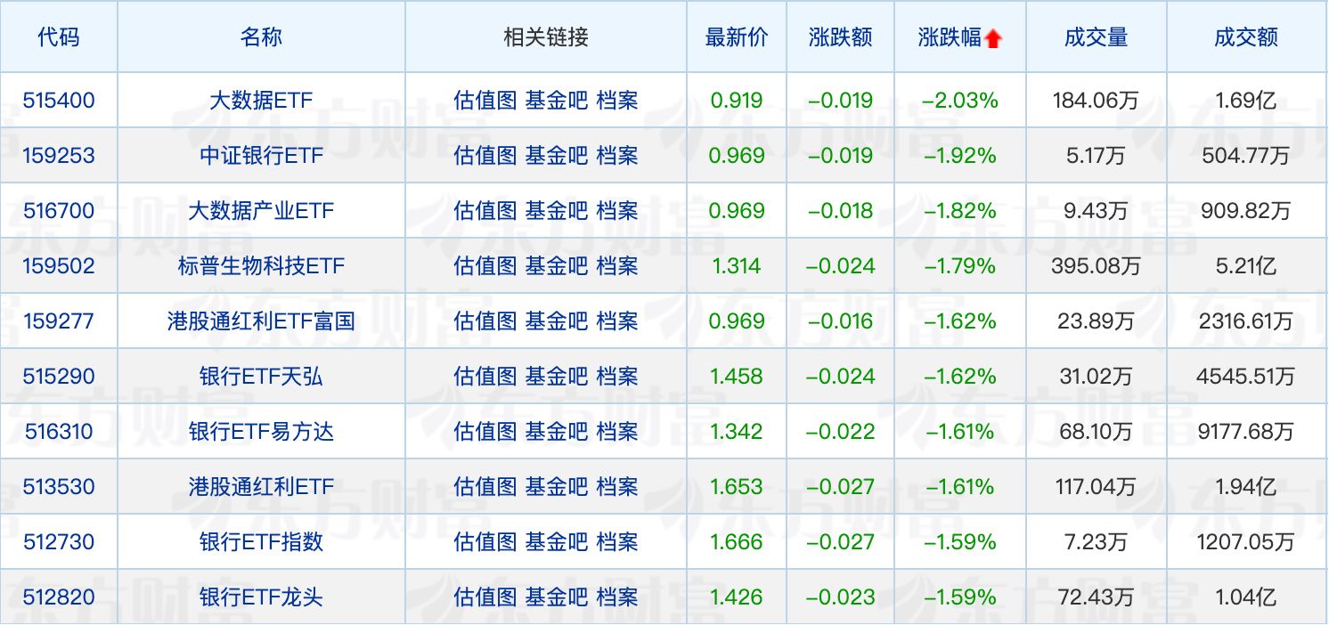 下跌方面,大数据ETF领跌2.03%。银行板块走弱,招商银行、农业银行下挫,多只银行相关ETF回调居前。