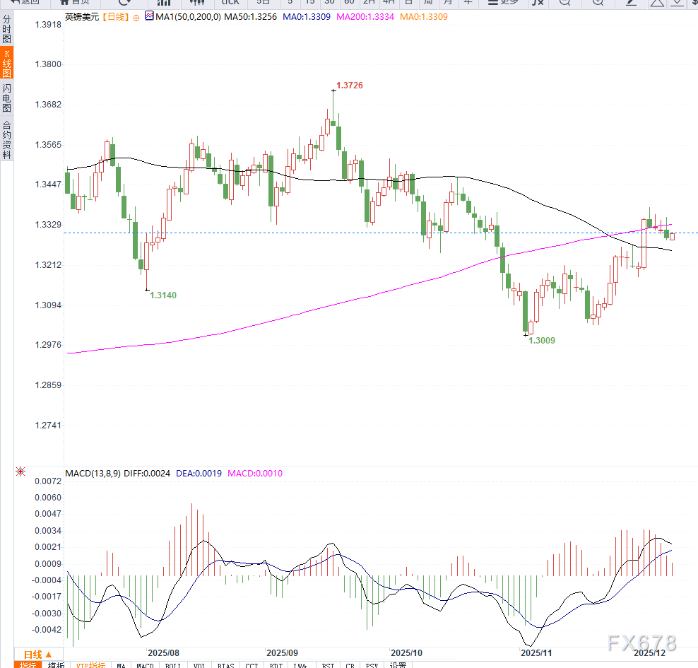 GBP/USD 在周三欧洲早盘小幅走强,交投于 1.3305 附近。美元受美联储可能降息影响略显疲软,而英镑则因英国经济数据趋稳而获得支撑。 ![]() “美联储短期降息已成共识,但声明措辞可能暗示未来放缓,对美元提供一定支撑。” ——某纽约外汇策略分析师 英镑受英国经济数据支撑 英国方面,市场正在消化秋季预算带来的税收压力及通胀放缓信号。近期数据显示劳动力市场降温,通胀压力减弱,这使市场预期英央行在 12 月会议上有 88% 概率下调利率 25 个基点。 “英国经济数据缓和降低了紧缩压力,市场对英央行降息高度定价,利好短线英镑。” ——伦敦某大型金融机构货币策略主管 短期来看,GBP/USD 在美联储鹰派降息与英央行潜在降息之间处于拉锯状态。从日线图来看,GBP/USD 正处于 1.3250–1.3350 区间整理结构。价格在下方 1.3250 附近获得支撑,上方 1.3350–1.3380 区域形成压力带。 短期均线走平,MACD 动能柱接近零轴,显示多空力量均衡。若突破上方1.3350,将有望测试 1.3400 阶段阻力;若跌破 1.3250,则可能回调至 1.3180–1.3200 支撑区域。整体技术面提示汇价仍以区间震荡为主,需关注政策导向催化突破。 ![]() GBP/USD 当前走势的核心矛盾在于 美联储鹰派降息与英央行潜在降息的政策分化: 美元短线可能因降息与鹰派指引获得支撑 英镑则因经济数据缓和和降息预期受支撑 短期内,汇价可能在区间内震荡, 关键突破仍需等待美联储声明与英央行 12 月会议的政策信号。关注两大央行政策声明对汇价的直接影响,以判断下一步方向。