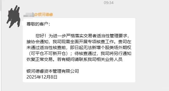 每经记者|李娜 每经编辑|叶峰 期货业场外衍生品市场迎来重要合规行动。据记者了解,近日,包括银河德睿资本在内的多家期货风险管理子公司已暂停新增个股类场外期权业务。多位相关业务人士表示,这是应中国期货业协会要求开展的专项自查,旨在全面、穿透地落实投资者适当性管理要求,防范业务“通道化”风险。 有期货风险管理子公司暂停新增个股期权业务 近日,一张关于银河德睿资本管理有限公司(下称“银河德睿”)发送给客户的通知在业内广泛流传。该通知显示,这家期货风险管理子公司为落实交易者适当性管理要求,需开展专项核查,期间将暂停新增个股类场外期权业务,但平仓业务可继续进行。