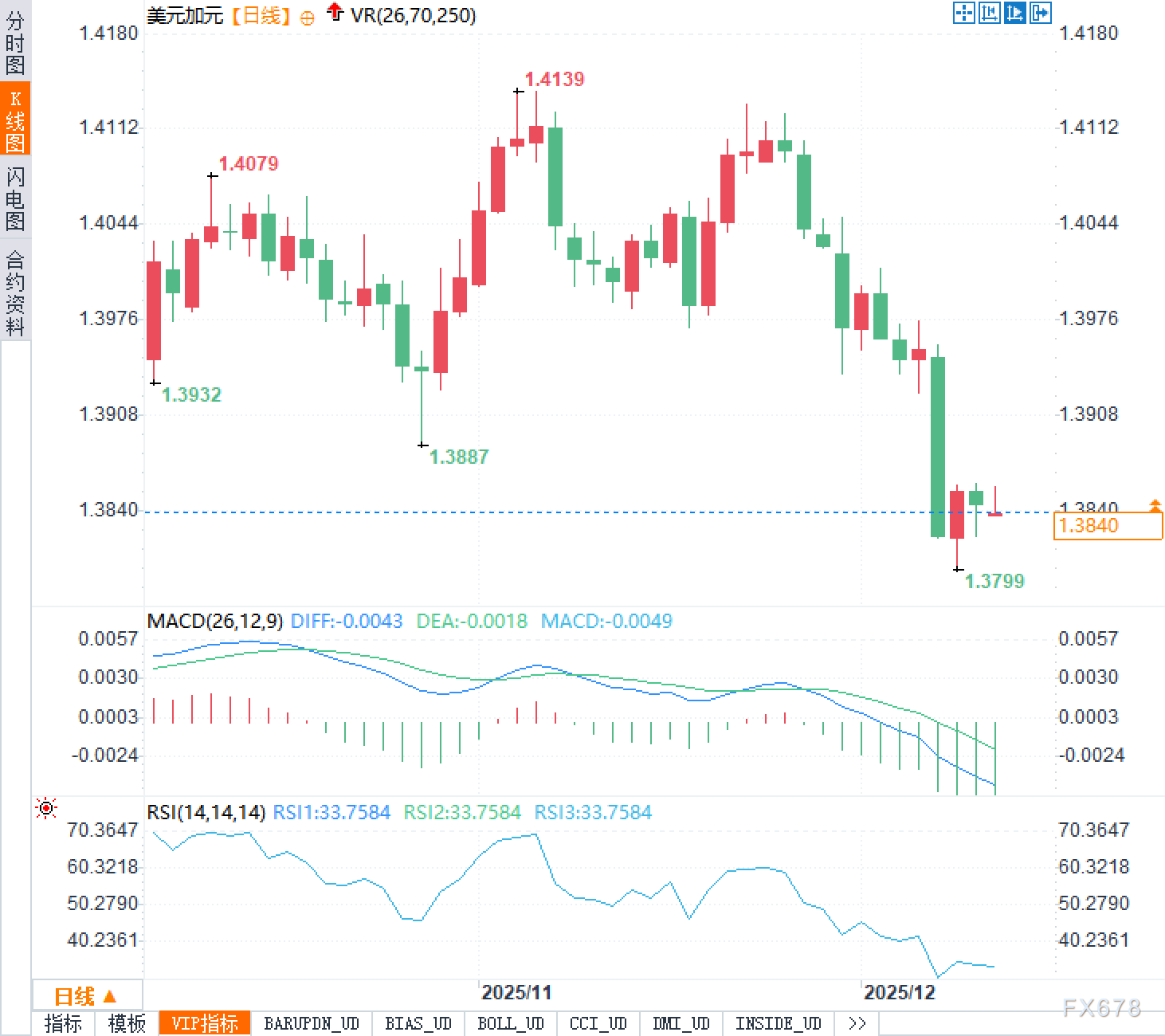 12月10日,星期三。美元兑加元北美时段交投于1.3840附近,成为市场关注的焦点之一。加拿大央行今晚22:45即将公布最新利率决议,这一事件可能对加元短期走势产生直接影响。尽管此前该行已连续两次降息,但近期政策信号显示其对当前利率水平持审慎态度,认为现有利率“大致处于合适位置”。这一立场若在本次会议中得以延续,或将限制加元进一步下行的空间,同时也影响美元兑加元的上行动能。 ![]() 值得注意的是,加拿大央行在10月下旬的上一次议息会议上将基准利率下调25个基点至2.25%,符合市场普遍预期。然而,更关键的信息来自会后声明——决策层明确表示当前利率水平“大致处于合适位置”,既能支持经济应对国际贸易环境变化带来的冲击,又足以维持通胀向目标靠拢。这一措辞被市场解读为暂停降息的信号,反映出政策制定者在刺激经济增长与控制通胀之间寻求平衡的努力。此次会议若维持利率不变,将进一步巩固这一立场,表明加拿大央行并不急于追随部分其他发达经济体进入快速降息周期。 市场表现 从日线看,美元兑加元自1.4139高点后重心下移,近期连续阴线放大并跌破前期整理区,最新报1.3840。下跌过程中最低触及1.3799,随后出现小实体K线与下影,显示短线抛压有所缓和但仍处弱势。 ![]() 展望未来 加拿大央行本次货币政策决定将于今晚22:45公布,随后行长蒂夫·马克勒姆将在23:30举行新闻发布会。市场普遍预计该行将按兵不动,维持基准利率在2.25%不变。真正值得关注的是会后声明的措辞变化以及对未来政策路径的引导。若声明重申“利率处于合适水平”的判断,并强调通胀仍具粘性,则可能强化市场对短期内无进一步宽松的预期,从而为加元提供支撑。反之,若提及经济下行风险上升或通胀回落速度加快,则可能被解读为未来仍有降息空间,进而施压加元。 综合来看,当前美元兑加元的运行逻辑主要由两大因素主导:一是美加两国货币政策的相对松紧程度,二是大宗商品特别是原油价格的走势。现阶段,加拿大央行表现出较强的政策定力,暂时搁置进一步降息。若未来数月加拿大就业市场保持稳健,家庭支出未现显著萎缩,那么加拿大央行维持当前利率的可能性将进一步上升,从而限制美元兑加元的上行潜力。
