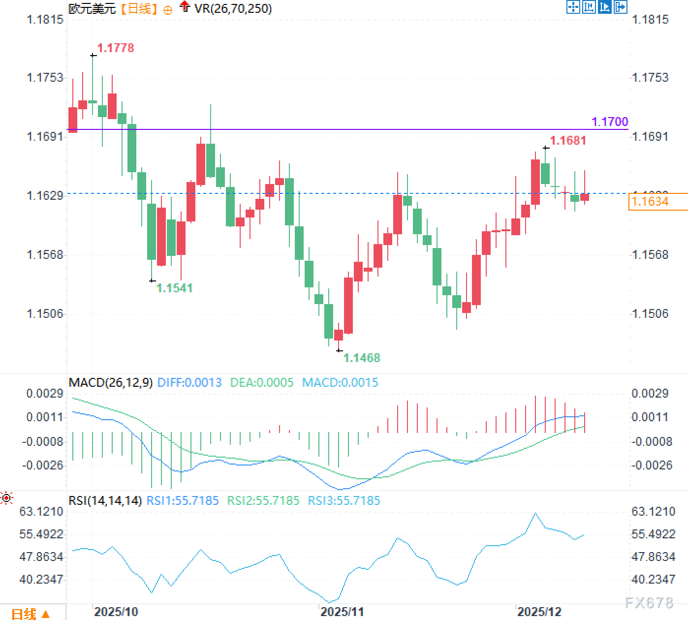 周三(12月10日),欧元兑美元在欧洲时段早盘一度冲高触及1.1660附近后遭遇抛压,随后回吐涨幅,汇价北美时段交投于1.1635一线附近。市场整体交投氛围谨慎,各方均在观望稍后凌晨03:00美联储货币政策决议的结果,这一事件料将成为短期行情的核心驱动因素。 ![]() 美联储即将公布利率决议,市场几乎已完全计入25个基点的降息预期,但本次会议的看点远不止于此。货币政策委员会内部分歧预计将达到近年来最大水平,因此点阵图所展示的利率路径预测以及美联储主席鲍威尔在随后新闻发布会上的措辞基调,将成为左右市场情绪的关键变量。 近期公布的美国宏观经济数据为美联储采取"鹰派降息"姿态提供了支撑。美国劳工部此前延迟发布的职位空缺数据显示,9月职位空缺数升至765.8万,10月进一步攀升至767万,较8月的722.7万大幅反弹,远超市场预期的720万。这一数据表明劳动力市场韧性犹存。叠加上周公布的个人消费支出物价指数呈现粘性特征,美联储在本次降息后暂停宽松步伐的可能性正在上升。 市场同时关注美联储对2026年利率路径的指引,目前期货市场定价显示明年仍有两到三次降息空间,若美联储点阵图释放更为谨慎的信号,美元或获得额外支撑。 欧洲方面,欧洲央行行长拉加德延续了一贯的表态风格,重申当前货币政策处于良好状态,并暗示可能再次上调欧元区经济增长预期。这一表态被市场解读为欧洲央行宽松周期已接近尾声的信号,对欧元形成一定支撑。从货币政策分化角度来看,若美联储暗示将放缓降息节奏,而欧洲央行维持政策稳定,欧元兑美元的上行空间可能受到压制。 白宫经济顾问哈塞特表示,货币政策仍有进一步宽松空间,但也承认若通胀压力抬升,情况可能发生变化。这番表态一定程度上缓解了市场对政策不确定性的担忧,但美元对此反应平淡。整体而言,美联储决议前市场处于观望状态,美元指数在近两个交易日累积涨幅后出现小幅回调,但波动区间依然受限。 技术面: 从日线图来看,欧元兑美元近期走势呈现明显的区间震荡格局。汇价自触及1.1468低点后展开反弹,于12月初攀升至1.1681附近遇阻回落,目前在1.1630支撑线附近徘徊整理。 上方关键阻力位于1.1700整数关口,自10月中旬以来多次对汇价形成压制,属于中期强阻力区域。更上方阻力参考前期高点1.1778,若能有效突破1.1700,则有望打开上行空间。近期反弹高点1.1681同样构成短期阻力,汇价需先克服此处压力方能向1.1700发起冲击。 ![]() MACD指标方面,当前DIFF值为0.0013,DEA值为0.0005,MACD柱状图读数为0.0015。快慢线均位于零轴上方,且DIFF线已上穿DEA线形成金叉信号,MACD红柱持续放大,显示短期动能偏向多头。然而,指标整体仍处于零轴附近的低位区域,尚未形成强势上攻态势,反弹力度仍需观察。 RSI相对强弱指标方面,14周期RSI目前读数为55.7185,位于50中轴上方但距离超买区域尚有距离。该读数表明当前市场处于多头略占优势的中性偏强状态,既未进入超买区间也未呈现超卖特征,为后续行情发展保留了空间。若RSI能够持续上行突破60一线,将进一步确认多头动能增强;反之若回落跌破50中轴,则需警惕空头反扑。 综合技术指标来看,MACD金叉与RSI位于50上方形成共振,短期技术面偏向多头,但1.1700强阻力的存在使得上行空间受限。若今日美联储决议引发剧烈波动,汇价突破当前区间的概率将显著增加。