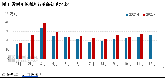 增势已定,挖掘机1-11月耗钢量赶超去年全年水平! 【导语】根据中国工程机械工业协会数据显示,2025年1-11月中国挖掘机累计总销量212162台,同比增加16.7%,超过去年全年挖掘机总销量5.48个百分点,2025年挖掘机行业对钢材产品需求同比上升趋势已成定局,内销与外销同步增长成为挖掘机销量持续增加的主要原因。 2025年1-11月,挖掘机对于板材产品总消耗量达到282.18万吨,较去年1-12月耗钢水平267.5万吨增加5.48%。2025年以来挖掘机行业产销量保持相对稳定的增长趋势,呈现行业逐步复苏的局面。挖掘机行业逐步复苏,带动板材产品需求呈现出较强韧性,从而在价格下跌过程中,起到一定缓冲作用。但由于挖掘机领域增长对于板材产品整体需求提振效果有限,因此难改市场总体需求下滑的局面。 2025年11月,中国销售各类挖掘机20027台,同比增长13.9%,其中国内市场销量为9842台,同比增长9.11%,口销量为10185台,同比增长18.8%。折算为对板材板材产品需求量来看,根据用钢量=挖掘机产销量*耗钢系数可以得出11月挖掘机产品对于板材消耗量在26.64万吨,同比增加13.85%,环比增加10.67%。