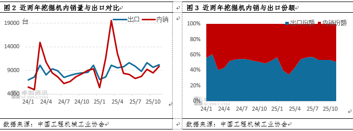 内需与外需齐发力,带动挖掘机需求同比回升 内需来看,1-11月,挖掘机国内累计销量108187台,同比增长18.6%,2025年以来,旧城区改造以及各个地区基建项目的开工推动国内挖掘机需求,另外,挖掘机产品到达生命周期的峰值,新旧机的更换以及迭代也带动新蔡采购相对集中,从而挖掘机内销保持正向增长趋势。 外需来看,1-11月,挖掘机产量累计出口量103975台,同比增长14.9%,占挖掘机总销量的49.01%。由图3可以看出,挖掘机出口占比在2月份最低,主要原因在于国内适逢农历春节,出口量出现一定下滑,随后多数时间,挖掘机出口份额保持在50%以上水平,彰显出挖掘机行业海外需求逐步扩张,中国制造业在海外市场具备较高市场占有率。