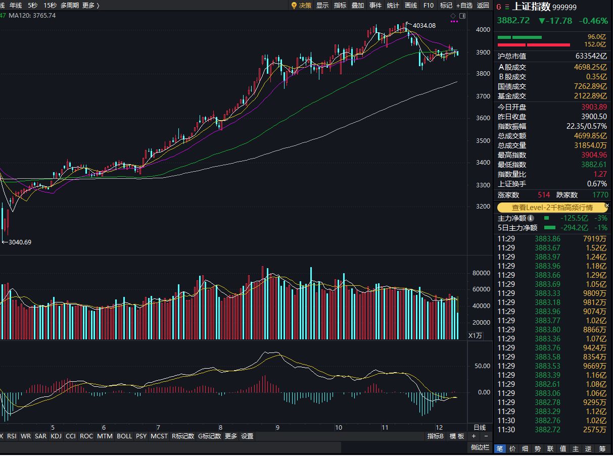 每经记者|杨建 每经编辑|肖芮冬 今日沪指震荡走低,创业板指小幅上涨。盘面上,超导概念、风电设备、可控核聚变、熔盐储能涨幅居前,商业航天在分化之后开始走强;而商业百货、预制菜概念、水产养殖、免税概念、社区团购、鸡肉概念表现不佳,跌幅居前。 截至午间收盘,沪指下跌0.46%,报3882.72点;深成指下跌0.18%,报13292.61点;创业板指上涨0.30%,报3218.55点;科创50指数下跌0.96%,报1333.71点;北证50指数下跌0.09%,报1388.60点。两市半日合计成交额11572亿元。