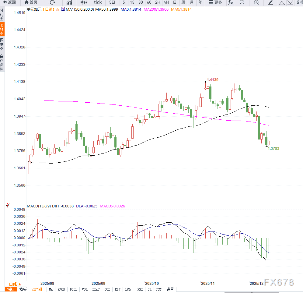 美元兑加币(USD/CAD)周四亚洲时段进入空头整理区间,在1.3800附近呈现弱势震荡。汇价维持低位,反映市场对政策与经济基本面分化的重新定价。 ![]() 加拿大第三季度经济数据显示,在贸易担忧情绪造成的外部扰动下,当地经济依然展现韧性,进一步增强了市场对加央行未来甚至可能加息的猜测。 政策预期的收紧,使资金回流加元资产。 油价反弹进一步支持加元。作为商品货币,加元与能源价格高度相关,隔夜油价的良好回升为加元提供额外支撑,形成对美元兑加币的多重压制。 与此同时,美联储刚刚宣布再度降息25个基点,并预测2026年仍将有一次降息。尽管如此,市场并未止步于此,根据鲍威尔的讲话,投资者仍然相信未来两次降息可能性上升。 “美国劳动力市场存在显著下行风险,我们不希望政策抑制就业创造。”——美联储主席鲍威尔。这种表态增强了市场对美国经济放缓的警惕,也推升了更多宽松政策的预期,使美元表现受限。 此外,特朗普近期对农业产品(包括加拿大化肥和印度大米)可能实施新关税的威胁也被市场视为负面风险,但加央行的鹰派取向与经济稳健暂时抵消了该因素的影响。 全球风险资产表现改善也削弱了美元的避险需求,使得美元兑加币继续承压。投资者目前关注美国与加拿大即将公布的贸易差额数据,以及油价和美元的短线波动情况,预计这些因素将在北美时段引发进一步行情。 日线图上来看, 美元兑加币维持1.3800附近弱势格局,整体呈现空头控盘迹象。K线持续在五日均线下方运行,显示反弹动能有限。MACD保持死叉状态,空头能量柱扩大;RSI徘徊在中性偏弱区域,未出现超卖,意味着仍有进一步下探空间。 短线支撑位关注1.3740与1.3680,若跌破将打开向1.3600延伸的结构性下行区间。上方阻力看向1.3830与1.3890,若无政策面明显逆转,突破概率较低。 ![]() 美元兑加币的下跌并非短期波动,而是政策分化长期化背景下的逻辑结果:加央行的鹰派立场强化加元支撑,美联储偏鸽的倾向削弱美元吸引力。 加上油价回升与风险情绪改善,未来几周美元兑加币仍倾向弱势运行。除非美国数据明显强于预期或加央行政策态度出现逆转,否则汇价难以有效反弹。