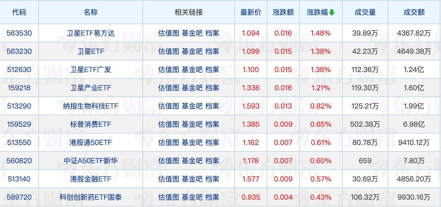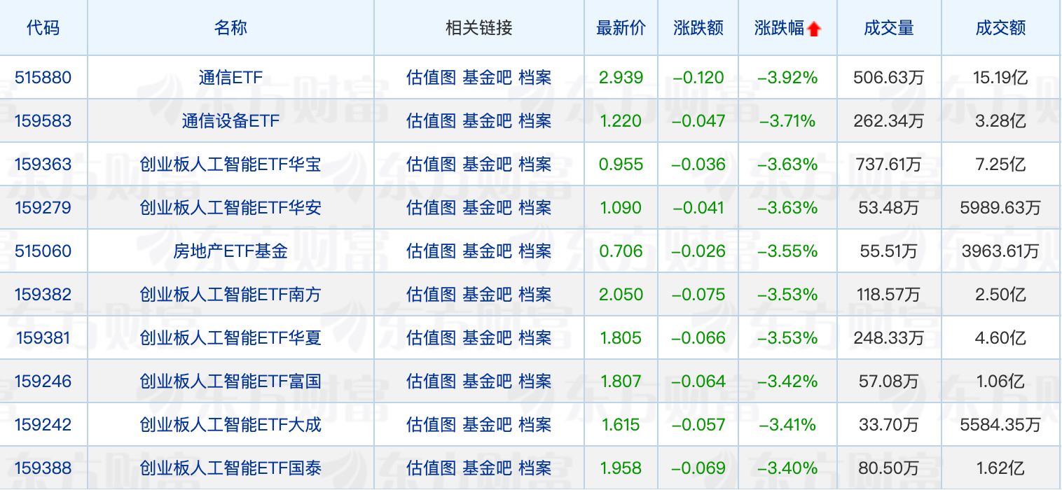 下跌方面,通信ETF领跌3.92%,创业板人工智能相关ETF悉数回调。