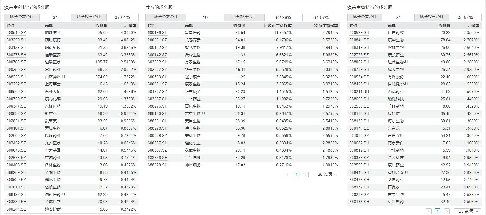 进一步对比两个指数的成分股,可以看到重合的成分股数量是19只,国证疫苗与生物科技指数独有的成分股数量是31只,中证疫苗与生物技术指数独有的成分股数量是24只。