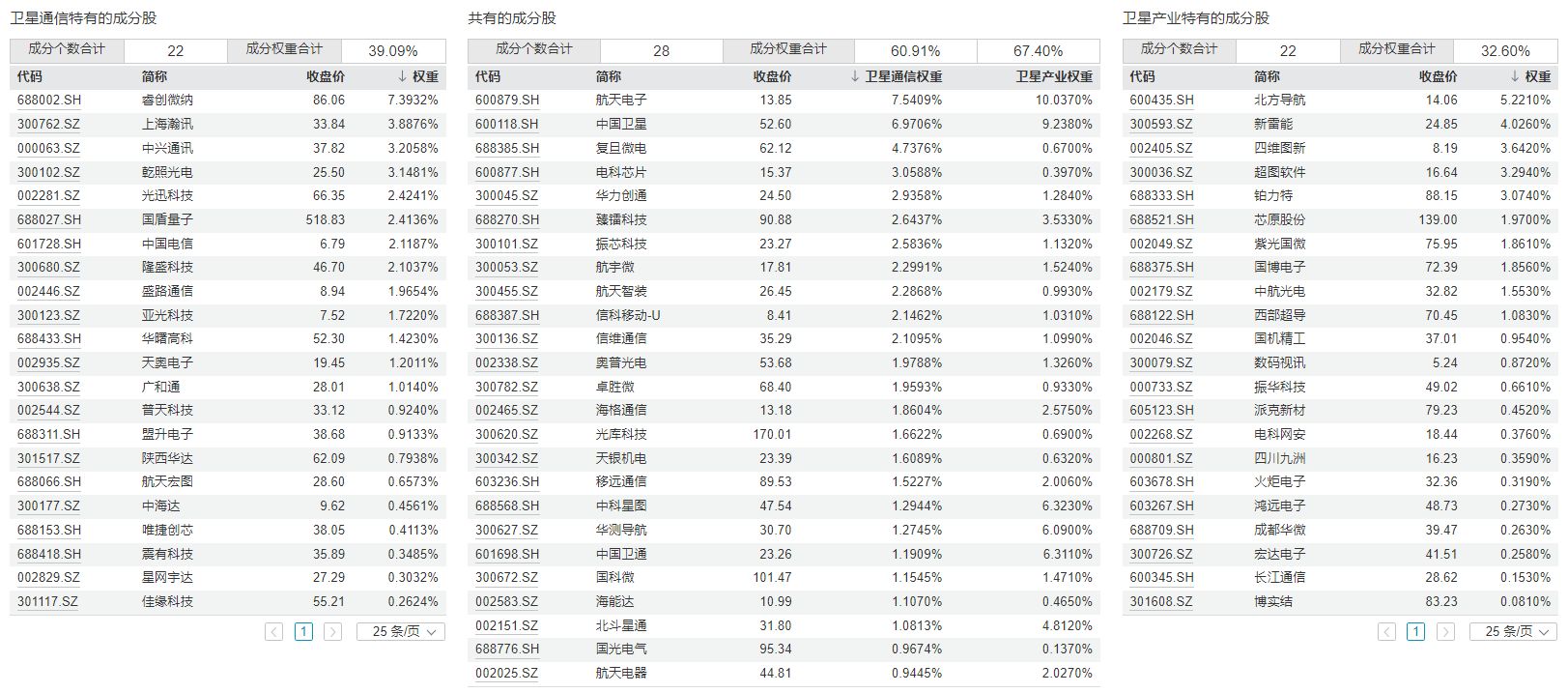 进一步对比两个指数,可以发现两个指数重合的成分股是28只,各自独有的成分股都是22只。其中国证商用卫星通信产业指数独有的成分股包括了睿创微纳、上海瀚讯、中兴通讯等,中证卫星产业指数独有的成分股包括了北方导航、新雷能、四维图新等。