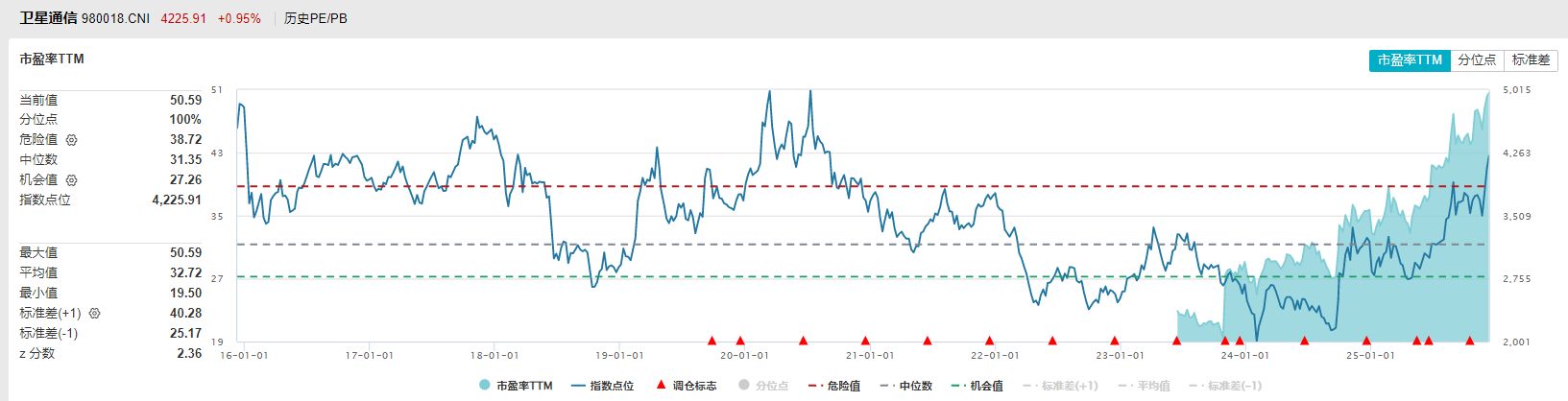 最后再对比两个指数的估值水平,Wind数据显示,国证商用卫星通信产业指数的市盈率TTM处在历史100%分位的位置,不过实际的数据是从2023年6月开始,因此可对比数据的时间区间较短。