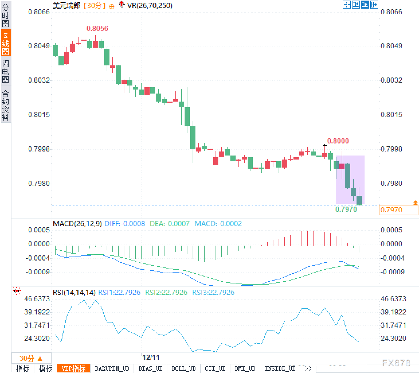 012月11日,星期四。在全球主要央行货币政策分化持续演绎的背景下,交易员的视线落在瑞士央行的年度收官利率决议之上。美元兑瑞郎汇价在过去3个交易日累计下跌近1%,目前欧洲时段交投于0.7970附近,逼近3周以来的 ...