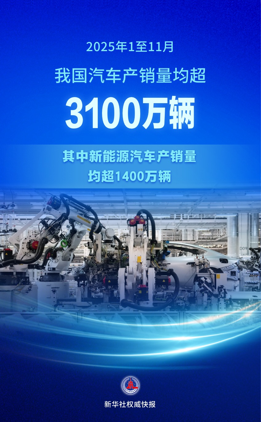 0记者12月11日从中国汽车工业协会获悉2025年1至11月我国汽车产销量分别为3123.1万辆和3112.7万辆同比分别增长11.9%和11.4%其中,新能源汽车产销量分别为1490.7万辆和1478万辆同比分别增长31.4%和31.2% ...