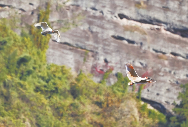11月28日,新宁崀山朱鹮野化基地,国家一级重点保护野生动物朱鹮在此悠然栖息。作为全球纬度最低的朱鹮野生种群繁育地,南山国家公园候选区自2022年起,分两批在崀山片区野化放归了24只朱鹮。
