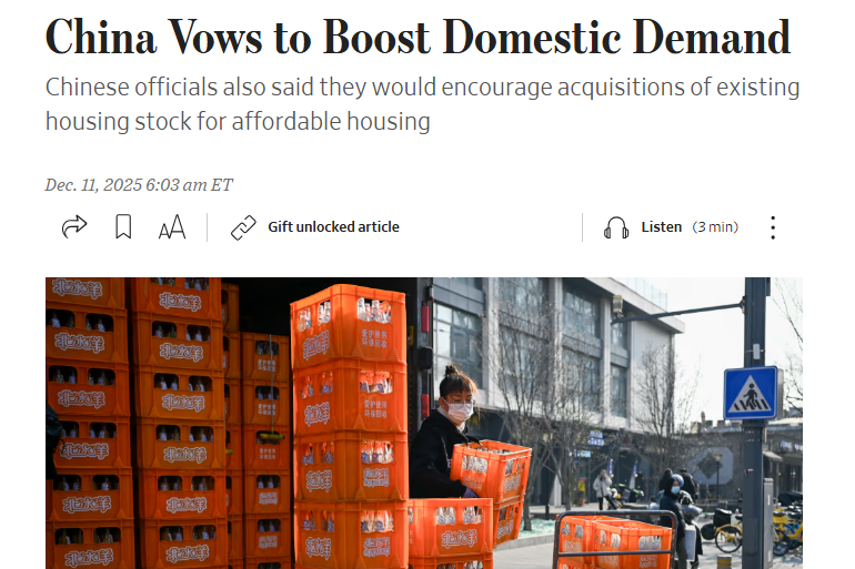 2025年12月10日至11日,中央经济工作会议在北京召开,为2026年中国经济工作指明了方向。多家外媒认为,会议传递出的明确信号不仅展现了中国应对复杂外部环境不确定性的坚定决心,还强调了推动高质量发展的长期战略目标。 1、加强内需驱动,激发消费潜力 中央经济工作会议明确提出,“坚持内需主导,建设强大国内市场”是明年经济工作的重点任务之一。 路透社在报道中关注到,中国将深入实施提振消费专项行动,制定实施城乡居民增收计划。报道指出,服务消费在中国拥有巨大发展潜力,相关举措将有效激活这一潜力。报道援引经济分析师克里斯托弗·贝多的观点认为,政府将采取更多措施支持家庭消费,进而持续提升国内市场的活力。