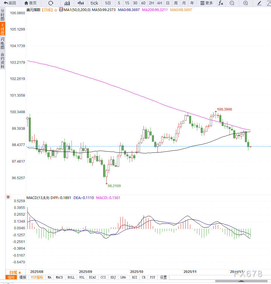 本周美元指数(DXY)持续承压,徘徊在98.13的七周新低附近,反映出市场对美联储未来政策路径的重新定价。尽管最新会议仅实施 25 个基点的降息,但投资者普遍预计未来降息节奏将显著快于决策者所暗示的节奏。 ![]() 一位外汇策略师表示:“当前美元的下跌并非单一因素所致,而是利率预期、风险情绪与政策沟通共同作用的结果。” 除了政策路径的分歧,市场近期关注到关于美联储独立性的讨论升温,而总统层面对更大幅度降息的呼声也令美元多头更趋谨慎。此外,本周宏观环境整体偏向风险偏好,进一步削弱美元避险价值。 在此背景下,下周的美国非农就业数据(NFP)、零售销售与 PMI 将成为判断经济韧性与未来政策节奏的关键窗口,预计将带动美元出现更大波动。 美元指数目前运行在偏弱区间,短线结构仍未出现反转信号。DXY 在跌破98.50支撑后进一步下探,目前多空力量在七周低位附近争夺。上行方面:若指数重新站上98.80,或将推动价格反弹至99.30与99.75一线,形成阶段性修复信号。 下行方面:若失守98.00整数关口,趋势将进一步目标97.40与96.85区域,市场可能进入更深的弱势通道。 整体来看,美元指数仍处于下行压力中,技术面偏向持续弱势震荡。 ![]() 美元当前面临的真正问题不是一次降息,而是市场与美联储政策预期之间的巨大落差。若后续经济数据继续偏软,市场将进一步强化宽松预期,使美元延续弱势。 反之,若非农或零售表现强劲,美元可能迎来一波迅速修复。短期内,美元走势将高度依赖数据层面,而政策沟通的分歧可能继续给美元带来额外波动。