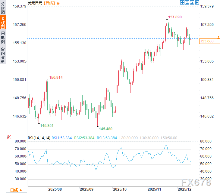周五(12月12日)亚洲交易时段,美元兑日元震荡反弹,涨幅约0.10%,但上行空间似乎有限。市场对日本首相高市早苗大规模支出计划及经济增速放缓导致日本财政状况恶化感到担忧。 ![]() 另一方面,由于市场对美联储进一步降息的预期增强,美元指数徘徊在周四触及的七周低点(98.13)附近。这与市场对日本央行的鹰派预期形成显著分歧,这种分化格局将为低收益的日元提供支撑,并抑制美元兑日元可能向上反弹的空间。 日元受风险偏好与财政担忧双重压制 周五亚洲早盘股市随隔夜美股涨势走高,削弱了传统避险资产的吸引力。此外,市场对高市早苗首相推行通货再膨胀政策引发的日本公共财政状况担忧持续,令日元持续承压。 周三公布的日本企业商品价格指数显示通胀率仍高于历史水平,印证了日本央行行长植田和男本周稍早的鹰派观点——日本央行基准经济和物价预测实现的可能性正逐渐上升。 这为日本央行进一步推进政策正常化提供了依据。在备受瞩目的12月18-19日日本央行政策会议前,交易商可能避免激进做空日元。此外,普遍的美元看跌情绪也将限制美元兑日元汇率的实质性上行空间。 美联储于周三结束为期两天的政策会议后,如期宣布降息25个基点,并预计2026年仅再降息一次。但投资者在美联储主席鲍威尔发表鸽派言论后,仍对2026年再降息两次抱有期待。 鲍威尔在会后记者会上表示,美国劳动力市场存在显著下行风险,美联储不希望其政策抑制就业创造。这使美元指数维持在周四触及的七周低点(98.13)附近,预计将对美元兑日元构成阻力。 目前交易商正关注联邦公开市场委员会重要成员的讲话,在缺乏美国相关经济数据的情况下,这可能为晚些时候的交易提供指引。但市场焦点仍将集中于下周备受瞩目的日本央行货币政策会议。 美元兑日元多头需等待汇价有效突破156.00关口 从技术分析角度看,上行方面,隔夜震荡高点(156.16)可能构成美元兑日元的近期阻力位。若能实现有效突破,或将触发新一轮空头回补行情,推动汇价测试周度高点157.00附近。后续买盘跟进将为汇价上探157.45的中期阻力位创造条件,并可能进一步挑战11月触及的157.89高位。 下行方面,首道支撑看向155.00,若该关口失守,美元兑日元可能加速下滑,重新测试上周五触及的154.34附近月度低点。随后154.00整数关口将形成关键支撑,若该位置失守,汇价可能进一步滑向153.60附近的重要支撑位,最终或将跌至152.00下方水平。 ![]() 北京时间13:57,美元兑日元交投于155.70/71。