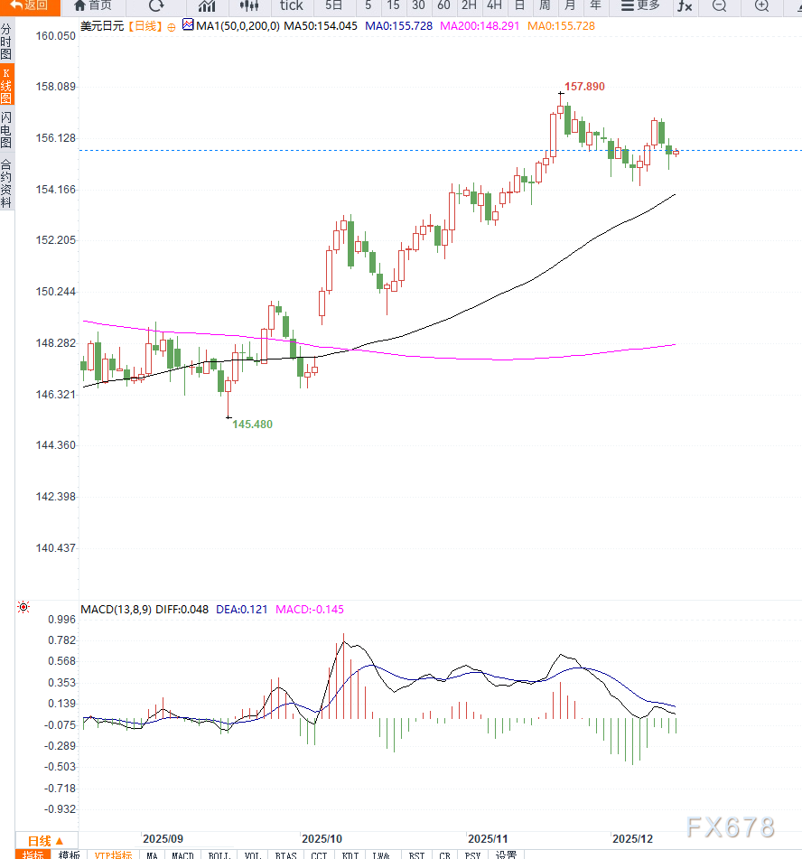 周五亚洲时段,美元兑日元(USD/JPY)维持温和回落,围绕155.60附近震荡。日元在避险需求回落的背景下表现偏弱,但整体跌势受限,主要因为市场逐渐接受日银可能于下周开启进一步政策正常化。 ![]() 不过,随着日本企业物价指数显示通胀仍高于历史平均水平,市场对日银加息预期迅速升温。 日银行长植田和男近期指出,经济与物价前景逐步具备实现条件,令市场开始提前布局潜在加息路径。 在关键会议即将召开之前,投资者普遍避免建立方向性过强的空头仓位,使日元仍保持一定韧性。 另一方面,美元整体继续承压。 美联储在本周下调利率并暗示未来仍将维持宽松空间,主席的鸽派表态使美元维持在两个月低位附近。对劳动力市场下行风险的担忧,使市场解读为美联储不愿继续维持紧缩力度,这直接抑制了美元反弹。 在美联储偏鸽、而日银偏向紧缩的政策分化下,美元兑日元的上行力度受限,市场情绪明显转向谨慎,等待日银下周的关键政策落地。 某日本外汇机构分析师表示:“财政不确定性削弱了日元的避险光环,但日银可能提前加息使空头缺乏继续压低日元的空间。” 一位分析人士指出:“美元整体偏弱,而日银可能转向紧缩,美元兑日元的结构性风险开始增加,短期波动仍将依赖政策信号。” 从日线结构观察,156.00至156.20区域构成短期上行的主要阻力带。若汇价突破并站稳此区间,多头或将展开新一轮空头回补,目标指向157.00一线,随后是157.50的阶段性压制。若势能延续,甚至有机会测试11月触及的158.00高点。 然而,只要汇价仍位于156关口下方,则上方压力依旧明显,短线走势仍倾向震荡整理。 下行方面,155.00为重要心理关口。 若日线收盘跌破,将令空头重新占据主导地位,并可能推动汇价快速回探154.35的月度低点 进一步下破154.00后,市场将关注153.60的强支撑位,若继续走弱,甚至可能回落至152.00下方的更深支撑区域。 整体价格结构体现明显的双向博弈特征,市场等待日银会议明确方向性指引。 ![]() 当前的美元兑日元走势本质上是财政压力、市场风险偏好与政策分化交织而成的震荡格局。日银潜在加息使日元具备实质支撑,而美联储的鸽派转向又持续削弱美元整体吸引力。 这使得原本应受避险需求影响的日元呈现“弱中带强”的结构。 真正影响中期趋势的核心变量将是日银会议是否释放明确的加息节奏信号。若政策路径更加清晰,美元兑日元可能迎来方向性突破;否则,汇价将保持反复震荡的状态。