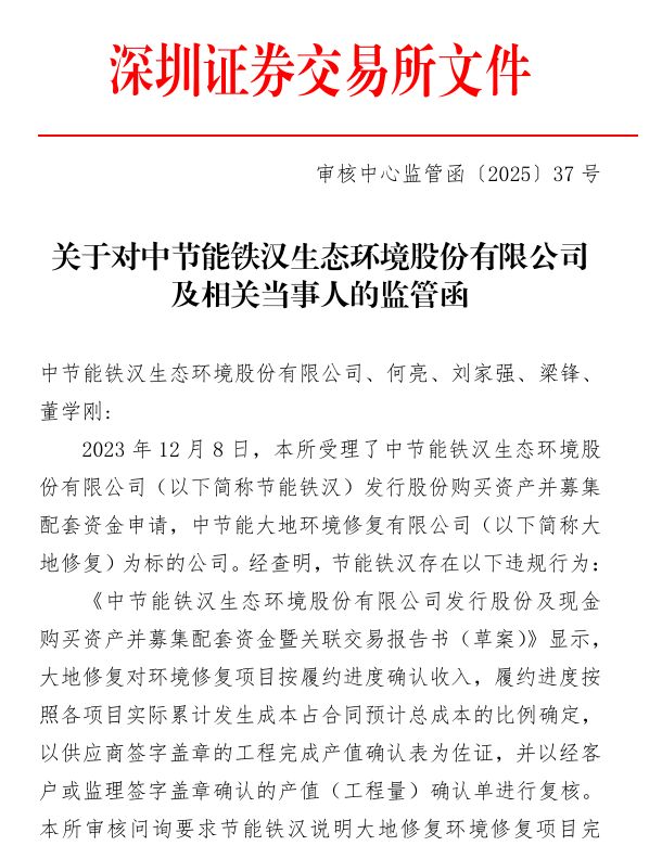 每经记者|王海慜 每经编辑|叶峰 2025年12月5日,深交所同步下发两份监管函。首先,深交所对中节能铁汉生态环境股份有限公司(以下简称 “节能铁汉”)及4名高管采取书面警示措施,经查,节能铁汉收购的大地修复部分项目存在提前确认收入情形。这已不是节能铁汉首次在财务规范上暴露出问题。去年9月,深圳证监局曾就财务会计核算不规范等问题对节能铁汉开出罚单。 此次,监管还将目光投向项目独立财务顾问国泰海通证券,因其在节能铁汉重大资产重组项目中,对标的公司提前确认收入事项核查不到位,同样被处以书面警示。该项目最初由原海通证券承接,此次处罚也成为券商投行业务履职疏漏的又一典型案例。公开信息显示,2024年以来,已有中航证券、光大证券、华创证券、招商证券、渤海证券等多家券商因担任财务顾问涉及违规而被处罚。 节能铁汉一年多时间两度被罚 日前,深交所在《关于对中节能铁汉生态环境股份有限公司及相关当事人的监管函》中披露,2023年12月8日,深交所受理节能铁汉发行股份购买资产并募集配套资金申请,标的公司为大地修复。根据当时披露的交易报告书草案,大地修复对环境修复项目按履约进度确认收入,履约进度按照各项目实际累计发生成本占合同预计总成本的比例确定,且有供应商产值确认表、客户或监理确认单双重佐证。节能铁汉在回复深交所审核问询时,声称大地修复收入确认相关内控制度健全且有效执行。