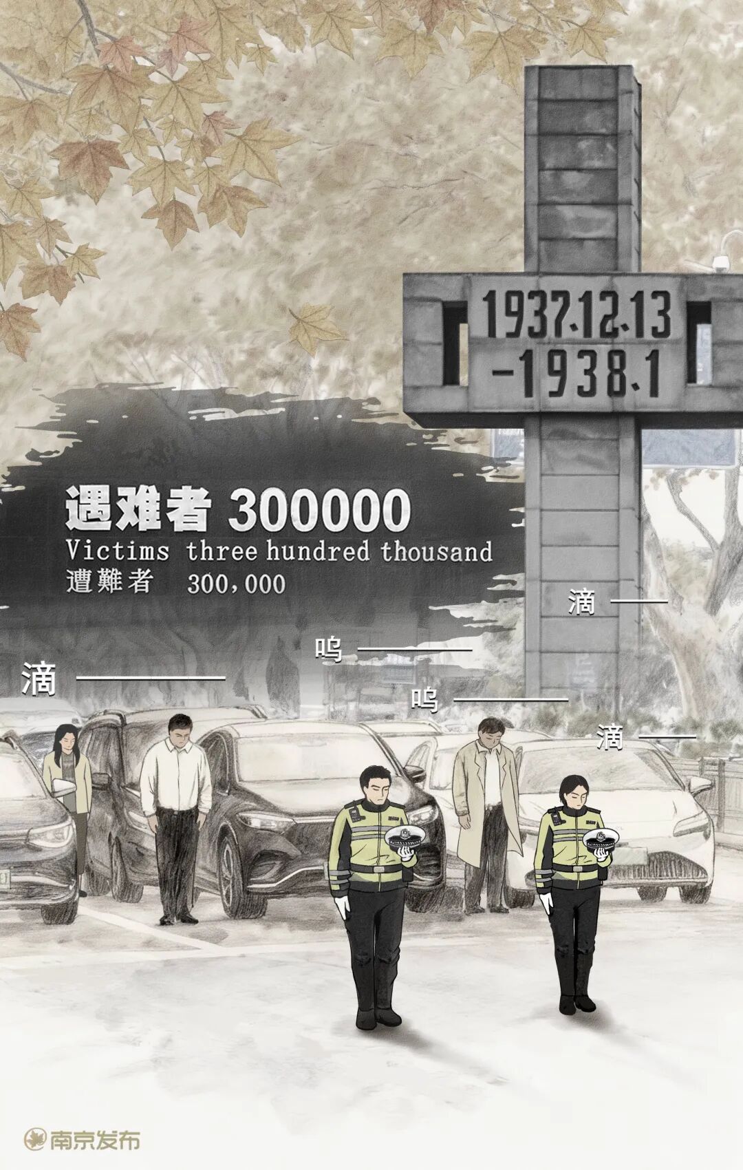 十点零一分至十点零二分,南京全城鸣响防空警报,汽车、火车、轮船鸣笛致哀,路上行人停下脚步默哀。