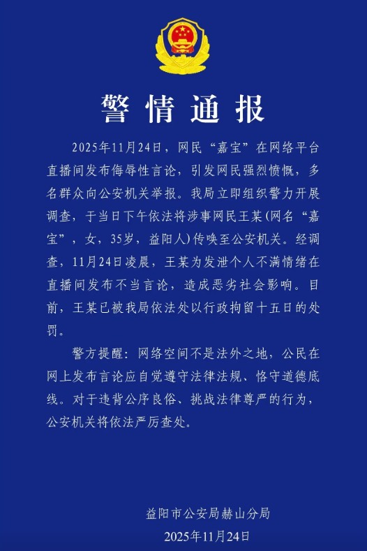 2025年“湘超”淘汰赛即将开战,球队、球迷都已蓄势待发。“湘超”常规赛让人血脉偾张、意犹未尽,但球场之外,网络戾气也时隐时现。热血,不应是网络暴力滋生的温床。 球场身体接触难免,发布侮辱性言论实属不该 11月22日,常德队主场对阵益阳队,常德队赵文荻贡献帽子戏法,帮助球队4∶0取胜。上半场第43分钟,赵文荻与益阳队球员马可发生身体接触,裁判示意赵文荻犯规,球迷区此时出现不和谐的骂声。赛后,益阳网民“嘉宝”又在视频直播间发布侮辱性言论。11月24日,“嘉宝”被行政拘留15天。