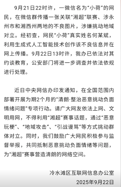 足球是一项身体强对抗运动,快速攻防过程中,碰撞难以完全避免。即使有伤害性动作,也自有赛场规则和后续纪律程序解决。然而,当个别冲突被碎片化剪辑,脱离具体情境后传播,却引发了对球员的恶意揣测,甚至人身攻击。那些在赛场上拼抢的运动员,下了赛场,却要面对潮水般虚拟世界的审判。 “湘超”常规赛末期,细心的观众或许已经察觉到微妙变化:一些原本作风硬朗的球员,在拼抢时出现了犹豫;那些曾经充满创造力的动作,似乎变得谨慎保守;身体对抗的强度,正在不自觉降低。这不是技术的退步,也不是态度的松懈——而是来自场外的无形压力正在侵蚀赛场。这不是大家想见到的。赛场不能被恐惧蔓延,它应该是勇气绽放的地方,还球员敢拼敢抢,也是还湖南足球纯粹热烈。 “湘亲湘爱”走得远,挑动地域对立被处理 9月27日,“湘超”第三轮,湘西队客场挑战永州队,双方最终0∶0战平。但在此之前的9月22日,永州网民“小荷”就因为制作涉及两地的不良图片、挑动地域对立被约谈教育并处理。