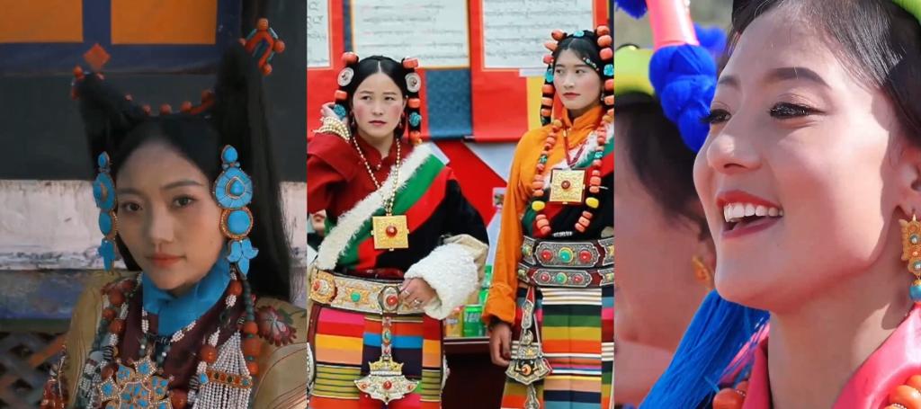 跟随记者,体验传统藏装。 一裹一系一搭,看似随意,实则颇有讲究,既要有高原的豪迈,又要有端庄的仪态。 最震撼的是戴上那些藏式首饰的瞬间,蜜蜡、珊瑚、松石,沉甸甸的挂在头上、颈间,贴在胸前。接住的不仅是一份美丽,更是一个民族对自然的敬意和对生活的歌颂。