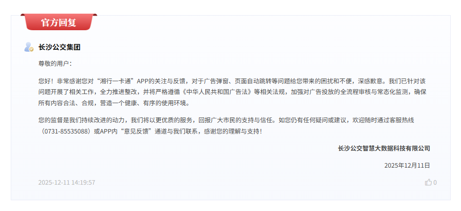 对此,长沙公交集团作出回应,向用户致歉并表示全力推进整改。回应称,集团已针对广告弹窗和页面自动跳转等问题开展了相关工作,全力推进整改,并将严格遵循《中华人民共和国广告法》等相关法规,加强对广告投放的全流程审核与常态化监测,确保所有内容合法、合规,营造一个健康、有序的使用环境。 另外,长沙公交集团表明,有任何疑问或建议,欢迎用户随时通过客服热线(0731-85535088)或APP内“意见反馈”通道与运营方联系。