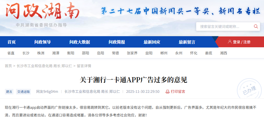 网友在《问政湖南》栏目上的发帖内容与官方回应。 红网时刻新闻12月15日讯(记者 陈星晓)近日,网友在红网《问政湖南》等平台反映,“湘行一卡通”App存在广告过多、易误触跳转等问题,严重影响使用体验。 网友特别指出,这些问题在强制更新App后变得尤为突出。对于年纪大的市民群体,复杂的广告界面常常使他们困惑,在进出站通道口操作缓慢,容易造成人流堵塞。 记者在12月15日的实测中发现,每次打开该App,会出现3秒的可跳转至第三方平台的开机页广告,乘车页面也存在广告通道。若误触,则会跳转至第三方平台或者第三方APP下载界面。