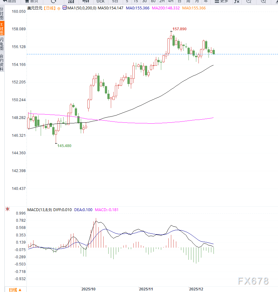 周一亚洲交易时段,日元(JPY)延续买盘吸引力,美元/日元(USD/JPY)回落至155.00中低位。市场关注焦点在于即将于12月18-19日召开的日本央行(BoJ)政策会议,以及行长上田和夫可能宣布的利率决定。 ![]() BoJ行长也表示,日本央行正在接近实现通胀目标,这进一步强化了市场对12月加息的预期。 与此同时,日本首相高市早苗的巨额财政支出计划,引发市场对日本公共财政恶化的担忧,这对日元形成一定压制。 美元方面,由于美联储未来降息预期升温,加之美国关键经济数据因政府停摆延迟公布,美元买盘有限。 特朗普提到其候选人可能成为下一任美联储主席并倾向于降息,也对美元形成压力。美日利差预期的背离继续支持日元避险买需。 技术面上,美元/日元短线承压于100小时简单移动均线(SMA)附近,约156.00位置未能有效突破,短期空头占优。 日线图振荡指标显示,价格下跌可能在155.00心理关口获得支撑,若跌破该水平,可能加速下行至月度低点154.30,并进一步测试154.00整数关口。 上行方面,若美元/日元收复并站稳100小时SMA,并突破前期高点156.10区域,可能触发短线回补,多头将关注157.00区域 ![]() 综合基本面与技术面判断,日元短期偏强、美元承压。BoJ加息预期、制造业景气改善以及美日利差预期背离,支撑日元走强。重点关注155.00支撑位的企稳与技术反弹机会,同时警惕美元短线回升带来的阻力区域承压风险。