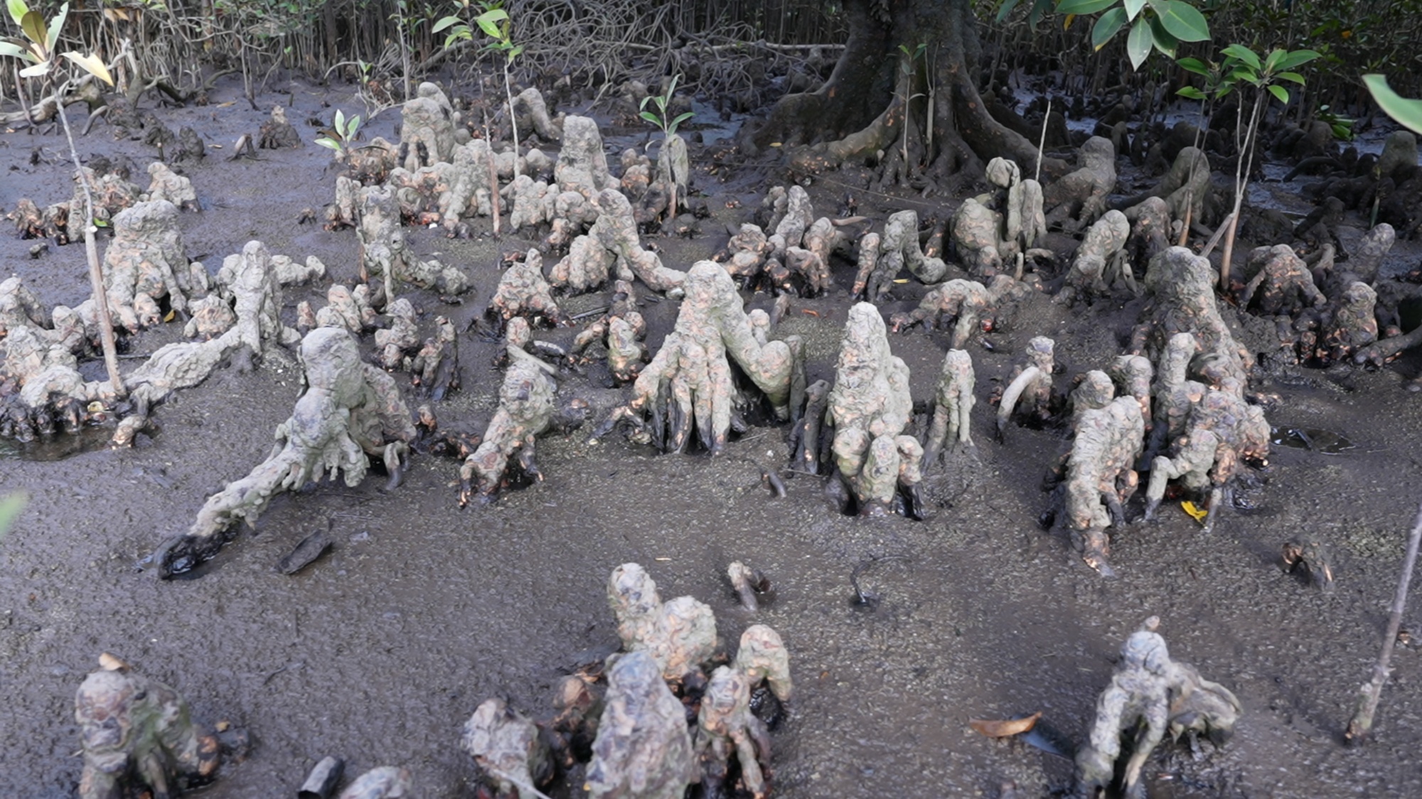修复团队在海底移植珊瑚(央广网记者 陶淦 制) 珊瑚礁被视为全球气候变化的“晴雨表”,尽管它仅占据全球海洋面积的不到1%,却孕育了十分庞大的生态系统,为约25%的海洋动植物提供了生活环境。而在距离该海洋牧场10公里的铁炉港红树林自然保护区,却藏着另一种“海”的模样。 初见红树林,其翠绿叶片与普通植物并无二致,得名“红”树,是因其树皮富含的单宁酸在“受伤”后氧化会变为红色。 三亚市林业科学研究院技术员王炳宇指着一片叶子说:“用指尖能摸到叶片表面薄薄的盐霜,因为泌盐腺能把红树林多余的无机盐排出来,这是它们的生存绝技。树干底下是红树林进化出的形态各异的呼吸根,为滩涂中缺氧的根系输送氧气。”王炳宇告诉记者,红树林要想在滩涂中生存下来,它们必须能为自己“代盐”、会呼吸。