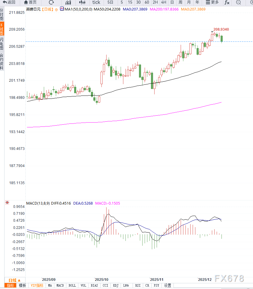 周一欧洲交易时段,英镑/日元(GBP/JPY)显著走弱,汇价下跌约0.5%,回落至207.30附近。此次下跌主要源于日元全线走强,而推动日元反弹的核心因素是日本最新公布的四季度Tankan企业景气调查数据。 ![]() 在日元走强的背景下,英镑表现相对平淡。投资者正等待即将公布的英国就业数据。市场预计,英国失业率可能上升至5.1%,而剔除奖金的平均工资增速或放缓至4.5%。 如果就业数据证实劳动力市场降温,将进一步强化市场对英国央行(BoE)在本周四降息25个基点至3.75%的预期。 总体来看,BoJ偏鹰、BoE偏鸽的政策预期差异,成为当前GBP/JPY承压的核心逻辑。 在政策会议结果公布前,市场情绪更偏向日元一侧,英镑/日元短线仍面临下行压力。 日线图形来看汇价自高位回落,短线进入调整阶段,动能明显转弱; 短期均线拐头向下,价格跌破部分短期支撑,显示空头占优;下方支撑关注207.00整数关口,进一步支撑在205.80附近; 上方阻力关注208.50及210.00区域; RSI自高位回落,尚未进入超卖区,暗示下行空间仍未完全释放; MACD高位死叉迹象初现,空头动能增强。 技术面显示,GBP/JPY短线偏空,若跌破207.00,回调空间或进一步打开。 ![]() : 在日本央行加息预期持续升温、英国央行降息几乎板上钉钉的背景下,英镑/日元的政策面逻辑明显利空汇价。短期内,若BoJ如期加息而BoE释放更鸽派信号,GBP/JPY不排除进一步下探至206甚至205区域。 需重点关注本周两大央行会议结果及英国就业数据带来的波动风险。