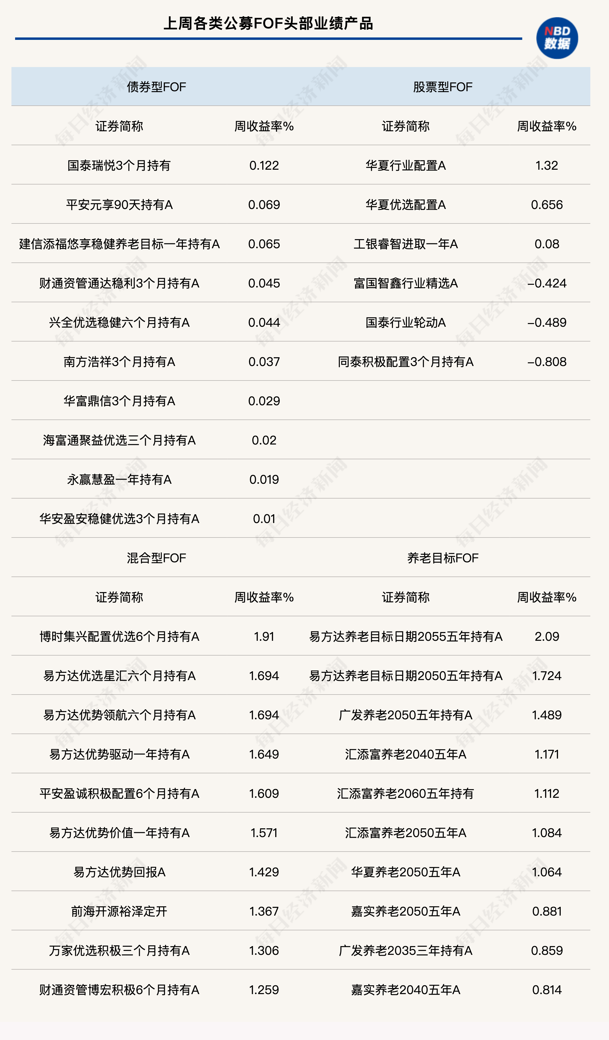 每经记者|任飞 每经编辑|肖芮冬 上周,科技股重拾升势,公募FOF的业绩也有明显改善,部分养老目标型基金的业绩走强。 值得注意的是,临近年底,公募FOF的业绩排名即将揭晓。从业绩情况来看,各类型公募FOF的头部业绩较为集中,产品竞争相对激烈。 科技股再送助攻,多只FOF单周涨近2%上周(12月8日~12月14日),科技股重拾升势。板块方面,通信、国防军工、电子板块涨幅居前。受此提振,权益类FOF的业绩表现出色,多只FOF单周业绩接近2%。易方达养老目标日期2055五年A上周业绩达2.09%,从三季度报告公布的持仓来看,重仓的易方达战略新兴产业C、易方达信息行业精选C等基金最近一周的表现较好。